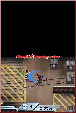 Hintergrund ist hier ein Upgradesystem für die Lebens und X-Faktor Leisten im Spiel, die anfangs eher klein gehalten sind und für das vorankommen zwingend verbessert werden müssen. Die letzte Anzeige definiert einen Kritikpunkt im Spiel. Ebenfalls im Top Screen zu finden ist eine Zeitanzeige von meist 5 Minuten. Innerhalb dieser Zeit müßt Ihr das Level gelöst haben, sprich das Ende erreicht haben. Schafft Ihr das nicht und die Zeit läuft ab beginnt Ihr das Level komplett von vorn. Hier schlägt gleich Kritikpunkt Nummer 2 zu. Rücksetzpunkte sucht man vergebens. Auch wenn die Level bei 5 Minuten Spielzeit nicht riesig in den Ausmaßen sind, ist ein Neubeginn nach einem Ableben oftmals nervig, da viele Stellen doch zäh zu spielen sind und man so leicht mal die Lust verlieren kann nochmal zu spielen. Problem ist dabei noch ein ganz anderes. Man weiß nie so richtig wo ein Level eigentlich zu Ende ist und ausladende Sucherei nach Bonus Items läßt man schnell mal bleiben. Das kann ein bestimmter Ort sein den man erreichen muß, ein bestimmter Gegner den es zu erledigen gilt oder ein Objekt das einzusammeln ist. Um nun aber z.b. die wichtigen Upgrades zu erspielen muß man zum ersten alle Bonus Items einsammeln und zudem das Level so schnell wie möglich abschließen. Beim meist ersten Besuch eines Levels geht das natürlich schlecht, man muß ja selber erstmal schauen wo was ist. Ist dann plötzlich das Level unerwartet zu Ende und der Statistik Screen zeigt an das man das Upgrade nicht erreicht hat kann man den Story Modus erstmal verlassen. Denn um die Upgrades zu erspielen findet man sich fast nach jedem Level im Score Modus auf dem Hauptmenu wieder und versucht die Upgrades durch die hier mögliche Levelanwahl zu erspielen. Und da die Scoregrenzen für die Upgrades teils sehr hoch sind sitzt man am Score Modus zunächst länger als einem lieb ist. Auf der anderen Seite aber gut das man die Möglichkeit überhaupt hat. Doch zurück zum Spiel und dem Gameplay selber. Gesteuert werden die Charaktere zunächst mit dem Kreuz und Ihr könnt sie nach allen Richtungen laufen lassen. Das DS typische Feature ist hier nun der Einsatz des Touch Screens. Denn die Action Tasten selber decken hier den Linkshänderteil ab. Was heißt das diese Tasten die gleiche Funktion übernehmen wie das Steuerkreuz. Wie also wird gekämpft?