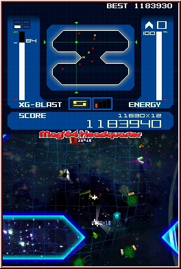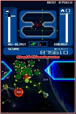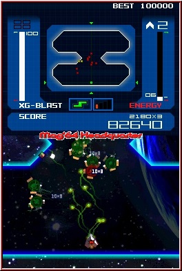 Etwas unglücklich gewählt wurde der Schwierigkeitsgrad. Dieser ist zunächst noch ganz human, zeigt sich aber im Folgenden als brachial anspruchsvolle Achterbahnfahrt des Schaffbaren. Wenn schier unzählige Feinddrohnen auf Euch einstürzen, tausende von Laserstrahlen gen Mutterschiff geschickt werden, um dieses in seine Einzelteile zu zerlegen, dann will man am liebsten den Nintendo DS schließen und einmal kräftig in die Stille der Nacht schreien. Nur absolute Masochisten werden sich am Härtegrad des Spieles wirklich erfreuen. Anders als bei „Geometry Wars- Galaxies" existieren bei „XG Blast!" auch Endgegner, die nochmals besonders heftig auftischen und scheinbar mit einer unvorstellbar großen Lebensenergieanzeige aufwarten. Das Problem an der Sache: „XG Blast!" ist in sogenannte Zonen unterteilt, also Abschnitte, bestehend aus mehreren Levels. So weit, so gut! Da Ihr in jede Zone mit einer bestimmten Anzahl von Wiederholungen eintretet, dürft Ihr nicht zu sorglos mit diesen umgehen. Es kann schnell passieren, dass Ihr beispielsweise im fünften und damit letzten Zonen-Level – etwa beim Endgegner – angekommen seid und dieser Euch vernichtend in Grund und Boden stampft. Sollte dem so sein, seid Ihr „Game over" und müsst die komplette Zone von vorne anspielen. Uns passierte dies bereits in der zweiten Zone mehrmals. Somit wendet sich der Titel ohne Zweifel an geübtere Spieler, die bereits einige Erfahrung mit sich bringen. Alle anderen werden lange zu beißen haben, ehe sie auch in höheren Abschnitten Erfolge haben können.