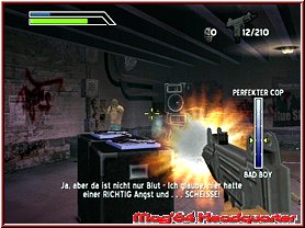 Mehr schon in den Bereich ärgerlich geht das Team Play. Seid Ihr mal zu zweit unterwegs könnte man ja annehmen das der CPU gesteuerte Gegner zur Unterhaltung beiträgt, sprich ebenfalls mitballert. Weit gefehlt. Zwar geht er den gesamten Weg des Levels mit und ballert auch. Nur kann man die wirklichen Erfolge des CPU Mitspielers zählen. Bei durchschnittlich 80 Gegnern pro Level sind bei den Team Varianten 1-2 auf das Konto des Mitspielers zurück zu führen. Hier wünscht man sich den Co-op, der sich wie schon erwähnt angeboten hätte. Verschärft wird das ganze dadurch das der CPU Dödel nicht draufgehen darf. Also heißt es mehr auf ihn aufpassen, als auf einen selber. Was bei der gebotenen Gegnerfülle durchaus interessant ist. ;-) Ihr merkt schon, im Moment habe ich noch nicht soviel gutes zu sagen über das Spiel. Und würde ich nur die ersten Akte für die Wertung heranziehen hätte Bad Boys II keine 30% verdient. Aber man kann dem Spiel auch gelungene Dinge unterstellen und in einem Feature fast schon etwas geniales.