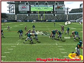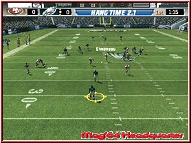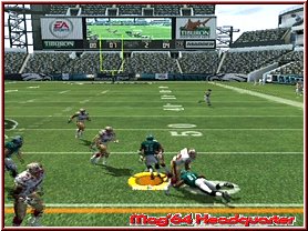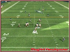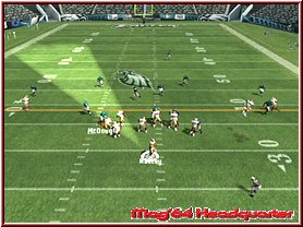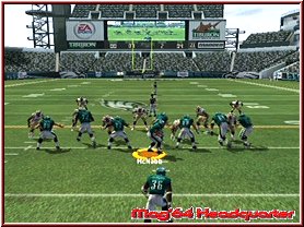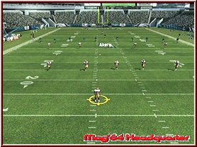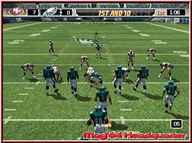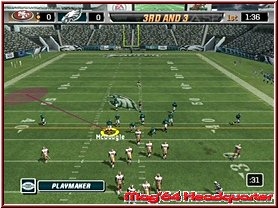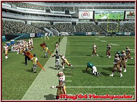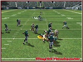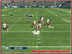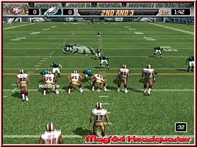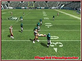 Dabei reagieren eure Team Mitglieder auch immer wie in den Playbooks aufgezeichnet. Für viele ein Buch mit sieben Siegeln sind diese mehr durch Ihr Bezeichnungen verwirrend. Nimmt man einen Angriffsspielzug und dabei vielleicht einen Pass Spielzug mit 3 WR, so sind deren Lauffwege fest eingezeichnet, inklusive Haken die sie schlagen. Ist im Spielzug z.b. eingezeichnet das der Receiver erst nach vorn rennt und dann einen Haken nach rechts schlägt, so muß man als Quarterback, den man steuert kurz warten und im richtigen Moment den Pass werfen. Reagieren muß man dann wenn die gegnerische Verteidigung den Spielzug erwartet und den Spieler z.b. abdeckt. Drückt man die A-Taste bekommt man alle Receiver per Button Symbol angezeigt und kann umstellen. Oder wie wäre es mit dem QB einen Lauf zu starten. Dabei unterstützt euch hier die neue Funktion QB Vision und ein wesentlich genaueres Wurffeature in Madden 2006. Die QB Vision ist wie ein heller Sichtbereich, den Ihr zuschalten könnt und somit Verteidiger auf dortige Receiver lenkt. Denn wie in der Realtiät schauen Verteidiger gerne mal auf die Augen des QB und wohin er sich orientiert. Das Ihr aber nun auf die andere Seite werft sagen wir ja keinem. ;-) Sehr positiv ist da eben das neue Pass Feature. Zwar spielt man weiterhin seine Pass Routen ab, ist aber manchmal ein wenig eingeengt in seinen Möglichkeiten. Sind z.b. alle Receiver abgedeckt wäre ein Wurf fast schon ein Fehler. Steht aber nun z.b. der Tight End frei würde man zu ihm passen wollen, was aber aufgrund des Spielzuges und eben keinem Button Knopf über dem Tight End nicht ginge. Hier kann man nun anfangs etwas ungewohnt mittels Stick und Kreuz einen freien Raum und jede beliebige Stelle anwerfen. Hier und da macht das ganze schon Sinn.