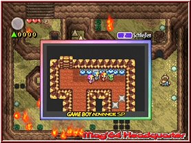 Grafisch darf man ebenfalls nicht soviel erwarten, als das mit Four Swords nun ein Meilenstein der Videospielgeschichte auf einen wartet. Dazu ist das gesamte Spiel zu sehr an die GBA Spiele angepaßt. Das beginnt bei der Sichtweise schräg von oben und endet in der Gestaltung der Umgebungen. Auf dem TV Screen kann die Grafik oftmals auch ein wenig grob wirken und wird nur feiner wenn man das Gebiet aufzoomt oder im GBA Screen agiert. Im Endeffekt eine für TV Verhältnisse angepaßte GBA Grafik. Aufgewertet wird die Grafik durch Effekte. Seien es Effekte in den Kämpfen die oftmals ein wenig an Wind Waker erinnern oder Farbspiele bei Endgegner Kämpfen. Technisch muß man sich natürlich keine Sorgen machen. Egal ob man nun mit allen vier Charakteren im aufgezoomten Screen agiert oder per Bogen zig Fackeln über den Screen verteilt anzünden muß. Das paßt also schon. Eine Bodenständige Umgebungsgrafik die durch Effekthascherei aufgewertet wird.