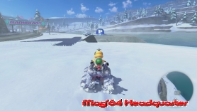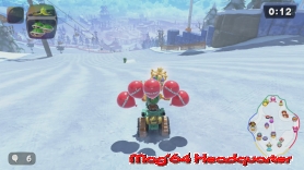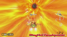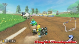 Speziell das Driften auf Geraden, wie man es früher oft bei Gegnern gesehen hat, ist jetzt nicht mehr so einfach möglich. Dafür "überdriftet" man auch kaum noch. Sprich man kann den Drift sehr lange halten. Wer einmal das Driften in einem Mario Kart Spiel "gelernt" hat, der kommt auch hier dennoch sehr schnell damit zurecht. Dabei gibt es aber auch hier eine kleine Neuheit. Man kann beim Geradeausfahren per Taste einen Sprung vorbereiten und geht einfach gesagt in die Hocke. Lässt man die Taste nach einem gewissem Moment los, macht der Charakter auch auf gerade Strecke einen Sprung, inklusive Bost beim Landen. Viele Strecken kommen dem Driften auch sehr entgegen, da man sehr oft auf weiche gefahrene und lange Kurven setzt. Rein fahrerisch hat man mit der Steuerung klar seinen Spaß, wobei das Salz in der Suppe aber einmal mehr die Items ausmachen. Hier findet man zunächst die gewohnten Inhalte aus den letzten Mario Kart Teilen, so dass hier keine Wünsche offenbleiben. Aber es gibt in World auch mal wieder einiges Neues. Immerhin 7 neue Items sorgen für Abwechslung, auch wenn nicht alle entscheidenden Einfluss haben. So als Beispiel die Feder mit der man springen kann, der Goldene Panzer erzeugt Münzen und der Fragezeichenblock füllt euch 20-Münzen fassende Anzeige schneller auf. Sinnvoll wer auch das letzte Quäntchen Geschwindigkeit aus dem Boliden holen will. Schon wesentlich effektiver sind andere neue Items wie die Eisblume. Das Gegenstück zu den Feuerbällen, die eure Gegner kurz einfrieren und fahruntüchtig machen. Ohne Schlau-Steuerung konnte man so Gegner auch mal herunterfallen lassen. Die Wurfhämmer finde ich cool, da man diese nach vorn und hinten werfen kann und für einige Unruhe sorgt. Ebenso der Mega-Pilz, bei dem man sich überdimensional aufpumpt und alles platt walzt was einem unter die Räder kommt. ;-)