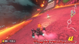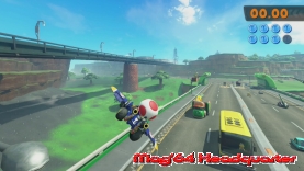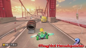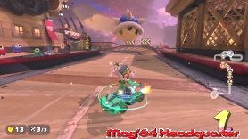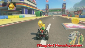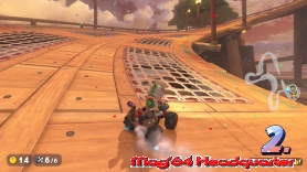 Was diesmal wirklich neu ist, dürfte für viele Spieler etwas Besonderes darstellen. Die Strecken selber kommen durch den Open World Charakter wesentlich größer daher. Natürlich gibt es viele Strecken, die auch mal eng und verwinkelt daherkommen. Aber der Anteil an extrem breiten Strecken mit vielen langen Geradeaus Phasen und sehr seichten Kurven ist wesentlich höher. Da kommen einem manche Abschnitte auch mal recht langsam vor. Man kann extrem weit schauen und bekommt durch die viel größere Umgebung in dem Teil durchaus eine neue Dimension. Dabei sind die Strecken schon mit festen Grenzen versehen, bieten aber dennoch teilweise extrem viel Freiheit beim Fahren. Klar Strecken wie Marios Piste sind eng und verwinkelt, aber dennoch eine riesige Tendenz, wenn man alle Strecken mal gefahren ist. Das macht Abkürzungen in meinen Augen seltener. Wenn sind es eher akrobatische Varianten, wo man Rails, Sprünge oder Wände nutzen kann. Dafür hat man bei den Gestaltungen schon geile Sachen hinbekommen. Allein die vielen Wasserabschnitte, die einen immer wieder an Wave Race Zeiten erinnern fand ich toll. Auch die unglaublich vielen Gimmicks, Gegner und normalen Straßenverkehr hat man besser eingebunden als früher. Kunststück bei den oft sehr breiten Strecken.
