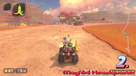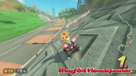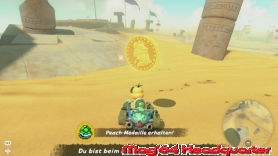 Am ersten Checkpoint müsst ihr also unter den ersten 20 sein, dann 16 usw., so das am letzten Checkpoint noch 4 Fahrer übrigbleiben, die den letzten Streckenabschnitt im Kampf um die ersten Plätze unter sich ausmachen. Genial und durch den fließenden Übergang aller Strecken extrem homogen und flüssig zu fahren. Das macht echt Laune. Hier bekommt man auch einen Vorgeschmack auf das letzte neue Highlight im Spiel - den Open World Modus Freies fahren. Über die Karte oder das Hauptmenü kann man sich dort einklinken und findet sich auf einmal wie in einem der typischen Spiele auf seinem Kart wieder und kann Fahren wohin man will. Auch hier sind alle Orte und Strecken in einem erfahrbar. Das ist natürlich mal komplett was anderes. Da es hier keinerlei Begrenzungen gibt, erkennt man die Strecken aus den anderen Modi in der Form auch nicht. Für den Entdeckerdrang hat man sich dennoch einiges einfallen lassen. Denn nur um mal frei umher zu fahren wäre der Modus schnell etwas ausgelutscht. Was auch daran liegt, das noch wenig los ist. Außer auf den Straßen fährt man oft sehr einsam durch die Gegend. Um das etwas spannender zu machen haben die Entwickler Aufgaben versteckt. Zum einen könnt ihr spezielle Peach-Münzen finden und sammeln, weiterhin spezielle ?-Felder auf dem Boden oder an Wänden finden, die man durch überfahren aktiviert.