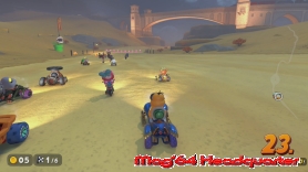 Denn sind alle Fahrer bestätigt, so wählen im Idealfall 24 Charaktere eine Strecke und am Ende wird per Zufallsgenerator davon eine gewählt. So wird auch verhindert das immer die gleichen Strecken genommen werden. Es sei denn alle Spieler wählen die gleiche. Danach geht es ans Eingemachte und der Online Modus zeigt seine wahre Gestalt. So martialisch will ich es mal ausdrücken. ;-) Denn hier zeigt sich die Macht von 24 Fahrern im Feld. Denn hier mal Ruhe zu haben ist ein Ding für sich. Denn alle setzen Items ein, alle wollen nach vorne und jeder will es besser machen. Langeweile gibt es hier nicht. Auch nicht davon zu fahren und ich haben kaum ein Rennen erlebt, wo der Sieger wirklich mal weit vorne war. Ständig ändert sich die Position und man fühlt sich noch mehr verfolgt als früher. Auch ist es seltener Mal ein Rennen zu gewinnen. Allein wenn 23 Leute hinter dir sind, es gibt immer einen mit Lila Panzer, der euch in die Suppe spuckt. Hier und da mal eine Abkürzung, mal etwas Glück und auch fahrerisches Können und man ist schon froh mal unter den Ersten 5 zu landen. Ist schon irre was da manchmal auf dem Screen abgeht. Muss gestehen hier ist die K.-o.-Tour im Online Modus noch eine Spur intensiver, aber auch fahrerisch anspüruchsvoller. Zumindest wenn man nicht gleich im ersten Stint rausfällt. Hier zählt dann in meinen Augen das fahrerische Können doch noch etwas mehr, als in den "kurzen" Online-Rennen. Nach einem Rennen bleibt man einfach in der Gruppe und kann bis zur nächsten Streckenwahl wieder im Open World Modus herumfahren und findet so durchaus auch mal eines der Secrets.
