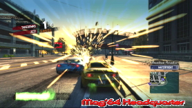 Dabei sind die Events in verschiedene bekannte Varianten eingeteilt. Zunächst gibt es natürlich schon reine Rennaction. Aber nicht auf abgesperrten Abschnitten und auch nicht Rundenbasiert. Sondern von einem Startpunkt zum Ziel, mal mehr oder weniger quer durch die Stadt. Gegen 7 CPU Gegner geht hier die Hats. Cool ist dabei dass ihr nicht auf die Streckenführung festgelegt seid. Ihr könnt fahren wie ihr wollt. Hauptsache ihr kommt als Erster ins Ziel. Klar kann man sich so auch gerne mal vertun und hängt nach einem verpassten Abzweig mörderlich hinterher. Hier überfrachtet man euch gerne mal mit Anzeigen und Hinweisen. Wenn man die Strecke nicht kennt, hat man oft gut genug damit zu tun auf die Gegner zu achten, den Straßenverkehr im Auge zu behalten, dabei die Karte und vor allem die Abbiege Zeichen. Den schnellsten Weg könnte man nehmen. Dazu gibt euch das Spiel vor markanten Kreuzungen schon einen Hinweis. Visuell und auch akustisch. Verpasst man ob des hohen Speeds aber gerne mal. Auch das ist Burnout in Reinkultur. Keine Streckenpfeile oder ähnliches. ;-) Kann man allein crashen ohne Ende, gibt es auch dafür einen speziellen Event. Hier geht darum innerhalb bestimmter Zeitfenster eine bestimmte Anzahl an Takedowns zu schaffen, sprich die Gegner so zu beeinflussen, dass sie extrem crashen. Genauso wie die eigenen Unfälle, werden diese herrlich in Szene gesetzt. Auch das zeichnet die Serie seit Anbeginn ja aus.