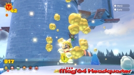 Damit das Spielprinzip mit Hüpfen, Schlagen und Rennen nicht ganz so eintönig wird, hat Nintendo in dem Special auch die fünf verschiedenen PowerUps eingebaut, welche wir schon aus dem Hauptspiel als auch anderen Mario-Spielen kennen. Mithilfe einer Eisblume verwandelt ihr euch in einen Klempner, der Eisgeschosse werfen kann oder eben in Tanuki-Mario, wenn ihr das Waschbär-Item einsetzt. Das Highlight ist und bleibt meiner Meinung nach aber immer noch das Katzen-Outfit. Damit seid ihr nicht nur im Sprint auf allen Vieren unterwegs sondern könnt bis zu einem gewissen Grad Wände hoch klettern. Das Tolle ist hierbei, dass ihr von jedem PowerUp bis zu 5 Stück auf Reserve haben und bei Bedarf einfach eines aus eurer virtuellen Klempnertasche hervor holen könnt.