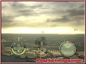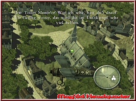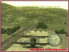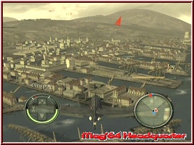 Einmal in der Luft drückt man die Taste 2 um das Fahrwerk einzufahren. Danach in der Luft greift nun ein einfaches aber butterweich zu bedienendes System. Neigt Ihr die Spitze des Nunchuk nach unten geht auch der Flieger nach unten. Hebt Ihr diesen an macht Ihr dies also auch mit der Nase des Fliegers. Neigt Ihr ihn zu den Seiten "lenkt" Ihr den Flieger auch so. Dabei ist das ganze weder ruckartig, noch zäh langsam, sondern später auch je nach Flieger sehr gut angepaßt. Stufenlos kann man den Flieger neigen und hat damit ein sehr gutes Fluggefühl für das jeweilige Fabrikat. Auch in der Luft hat der Stick seine Bedeutung. Zieht Ihr ihn nach hinten könnt Ihr die Luftbremse nutzen und in Verbindung mit der Neigung engere Kurven fliegen. Drückt Ihr ihn nach vorn beschleunigt Ihr und könnt je nach Flieger sehr konsequente Manöver bis hin zum Looping fliegen. Alles geht dabei flüssig vonstatten ohne das es irgendwie unrealistisch wirkt. Zwar habe ich natürlich noch nie selber am Knüppel einer solchen Maschine gesessen, aber man bekommt sehr schnell ein Gefühl für die Steuerung, die mit zum Besten gehört was man in der Form spielen durfte. Auch abseits des Steuerns via Nunchuk. Voll kontrollierbar und butterweich in der Umsetzung. Einmal in der Luft werden euch selbst in dieser Tutorial Mission verschiedene Aufgaben gestellt. Das beginnt beim Überfliegen einer Stadt und dem Abwerfen von Flugblättern. Eigentlich nur ein Vorberreitung auf Bombenabwürfe mit späteren Maschinen. Denn neben der Z-Taste für die Bord Geschütze gibt es den C-Knopf für diese Art der mitgeführten Waffen. Später wird das System aufgewertet durch Bomben, Torpedos und Luft-Luft Raketen, was aus dem Spiel auch weit mehr macht als nur ein reines Luftkampfspiel. Dabei kommt nun eine Funktion hinzu, die vor allem Kameratechnisch teils atemberaubende Sichtweisen auf den Schirm zaubert. Habt Ihr z.b. ein festes Ziel in der Luft oder auch am Boden, so kann man dieses fest "arretieren". Mittels A Taste kann man dieses Objekt fest in das Visier nehmen ohne es praktisch aus dem Auge zu verlieren. Dabei geht die Kamera nun weit weg vom eigenen Flieger, der sich nun praktisch zwischen Kameraposition und Objekt befindet. Da Ihr ja weiterhin normal fliegt ergeben sich phantastische Blickwinkel.