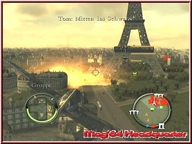 Ebenfalls hier und da beeindruckt war ich vom grafischen Ambiente und dem Stil des Spiels. Keine harten Farben oder wenig Texturen, sondern viel Abendstimmung, ein wenig Nostalgie Feeling und vor allem teils sehr überzeugende Bodengestaltungen. Paris, Berlin oder auch London sind dicht bebaut und das ganze mit weit mehr als 2 oder 3 Standardhäuser die man einfach aneinander gebaut hat. Es wirkt sehr auf den Betrachter wenn Ihr schräg von oben Richtung Eifelturm fliegt oder japanische Träger unter Beschuß nehmt. In die gleiche Kerbe hauen auch die Fliegermodelle, die sehr detailgetreu aussehen und in Sachen Proportionen passen. Gegner erkennt man und erlebt deren Abschüsse teils sehr nah und eindrucksvoll am eigenen Flieger. Stimmige Explosionen unterstützen auch hier die Dynamik. Das Spiel protzt daher nicht unbedingt mit Farbpower ohne Ende, dafür aber sehr mit atmosphärischen Umgebungen. Selbst die Wintermission in den Ardennen paßt da dazu. Einzig die Bodentexturen wenn man sehr knapp darüber hinweg fliegt sehen ein wenig einfach gemacht aus. Nur ist man selten so weit unten. Technisch gibt es nur einmal richtig was zu meckern. Gerade die Normandie Mission und Landung der Alliierten ruckelt schon etwas stark. Alle anderen Missionen, egal ob über dem voll bebauten Berlin oder Paris sind dagegen viel besser. Perfekt ist die Framerate zwar nicht durchgehend, aber auch nicht störend oder gar unspielbar.