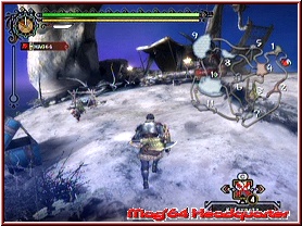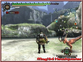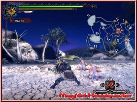 Das Spiel bietet zudem einen Tag/Nacht Rhythmus, der euch neben visuellen Unterschieden auch spielerische Variationen in Sachen Monstern oder Materialien bringt. Verlässt man also das Dorf für eine Stippvisite, kommt natürlich auch die Steuerung zu ihrem Recht. Auch diese ist, egal welchen Controller man benutzt, anfangs ein wenig Gewöhnungsbedürftig. Klar das mit dem Stick gelaufen wird. Die A-Taste hat nun mehrere Bedeutungen. Hat man die Waffe nicht in der Hand, kann man damit z.b. Dinge aufsammeln. Hat man die Waffe in der Hand, dient sie dem Angriff. Hier greift ein ähnliches Prinzip wie in PSO, wenn auch nicht ganz so extrem. Einfaches Tastengehämmer bringt euch hier gar nichts. Also gilt es wieder ein bestimmtes Timing an den Tag zu legen, um erfolgreich zu sein. Ihr habt eine Funktion für die Hocke oder den Block und könnt mittels C-Taste die Kamera jederzeit hinter den Helden holen. Höhe und Drehung der Kamera lässt sich zudem mit dem Steuerkreuz verändern. Eine Zielfunktion gibt es im übrigen in dem Sinne nicht. Das ist so gewollt und führt gerade bei vielen Gegnern um euch herum, durchaus mal zu recht hektischen Momenten. Denn wir alle wissen, dass die Kamera in solchen Momenten selten der Freund des Spielers ist. Man arrangiert sich aber dennoch recht schnell damit. Dennoch gerade in Sachen Kampfaction ein nicht zu unterschätzender Punkt. Im Bild unterstützt werdet Ihr zudem von verschiedenen Anzeigen. Ganz wichtig sind oberhalb 2 Leisten. Neben der Variante für die eigene Lebensenergie, existiert darunter ein zweite für die Ausdauer. Setzt man z.b. die Z-Taste für das Rennen ein, verbraucht man Energie aus dieser Leiste. Sie regeneriert sich zwar wieder von selber, baut aber mit der Zeit dennoch ab. Dazu kommt unten rechts ein Menu zu seinem Recht, bei dem man eigene Dinge wie Tränke oder Essen nutzen kann. Per gedrückter C-Taste ruft man dieses Menu auf und kann dann per Kreuz nach Links und Rechts scrollen. Hat man das gewünschte angewählt, kann man es mit der 1-Taste benutzen. Die 2-Taste dient dem Aufruf des Pausenmenus, in dem man sich z.b. Infos zur aktuellen Quest, dem Status und Ausrüstung des Spielers, oder dem Rucksack widmen kann.
