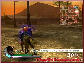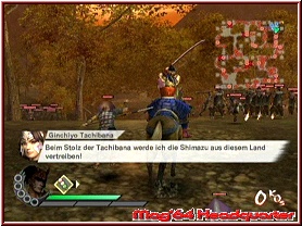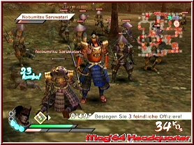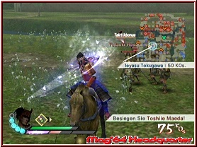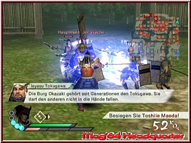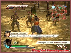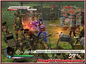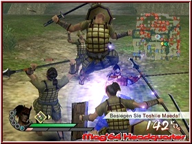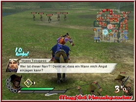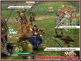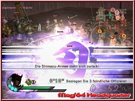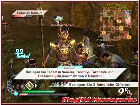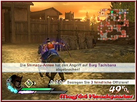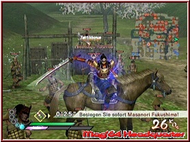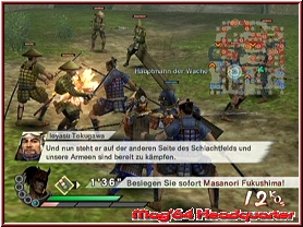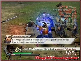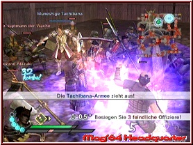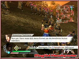 Zu guter letzt deckt Remote-technisch die B-Taste den sogenannten Musou-Angriff ab. Eine sehr typische Aktion der Serie, die einen weiteren mächtigen Angriff definiert. Bleiben die Tasten des Nunchuk. Auch diese sind belegt und man kann mit der Z-Taste Blocken und nach dem Hinfallen schnell wieder aufstehen. Die C-Taste wiederum deckt die letzte Angriffsvariante ab, den Geistangriff. Für diesen und die Musou Varianten existieren um das Charakterbild links unten jeweils Anzeigen. Zu Beginn des Spiels stehen euch nur die kleinen Kreise für die Geistattacke zur Verfügung, während bis zu 3 Einheiten für den Musou-Angriff erst nach und nach erspielt werden müssen. Logisch das Gegner das zeitliche segnen müssen, um diese Anzeigen zu füllen. Wenn ich euch jetzt noch erzähle, dass man all dies noch in diverse Combos umgesetzt hat, könnt Ihr euch vorstellen, was bei der Menge an Gegnern und Attacken Möglichkeiten auf dem Screen abgeht. Es ist dann schon eine einzige Metzelei. Neben diesen Anzeigen fehlt dann eigentlich nur noch die eigene Lebensleiste, die man tunlichst im Auge behalten sollte. Denn nur hier im Story Modus kann man auch mitten in der Schlacht mal Speichern, bei den anderen Modi müsst Ihr neu Anfangen oder eben die Schlacht zu Ende spielen. Ausgestattet mit diesem Grundwissen, könnt Ihr euch nun an die Spielziel wagen. Auch da geht das Spiel einen mehr als geilen Weg. In jeder Schlacht gibt es natürlich ein übergeordnetes Ziel, das sich meist dadurch definiert, dass Ihr einen gegnerischen Heerführer und damit anderen Samurai eliminieren müsst. Das sind dann so nach und nach alle, die man auch selber führen kann. Auch das macht es durchaus interessant. Hier heißt es also diese zu Finden. Neben diesem Hauptziel gibt es aber auch abseits einiges zu tun, mit dem man sich selber zum einen Belohnen kann, oder auch die Schlachten selber erleichtert. Alles nicht ganz unwichtig. Auch wenn euch tausende an Fußtruppen entgegengeworfen werden, zwischendrin laufen auch reichlich Offiziere umher. Diese erkennt man an einer entsprechenden Bezeichnung über dem Kopf. Eliminiert man diese, erhält man zum einen neue und teils seltene Waffen und Ausrüstungen, oder einen sogenannten Taktik Bonus. Erledigt ihr z.b. einen Samurai, der mit seinen Truppen ständig eure linke Flanke angreift, so hat sich das Thema mit seinem Tod erledigt.