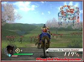 Die Schlacht selber beginnt damit, das es einen kleinen Kameraflug über das Areal gibt. Man sieht schnell, das die 3D Umgebungen äußerst ausladend sind und vor allem Laufend mit dem Charakter einiges in Anspruch nehmen was den Zeitfaktor angeht, wenn man sie durchquert. Nach dem Kameraflug findet man sich in der eigentlichen spielerischen Action wieder und Samurai Warriors 3 zeigt sein wahres Gesicht. Wie schon erwähnt ist es ein reiner Live Action Titel, bei dem Ihr den Helden aus der Third Person Sicht zu sehen bekommt. In dieser Sichtweise steuert ihr ihn logischerweise auch und dürft von nun an eure Waffen sprechen lassen. Gerade im Hinblick auf den kürzlich vorgestellten Red Steel 2, sollte man sich aber schnell vor Augen führen, das der Titel nichts mit Freien Bewegungen am Hut hat. Bei 500 und mehr Gegnern pro Schlacht könntet Ihr sonst wohl auch euren Schwungarm in die Ecke stellen. ;-) Wobei die Zahl nur die erledigten Gegner beschreibt. Begegnen werden euch teilweise mehrere Tausend Gegner auf den Schlachtfeldern, wenn auch nicht alle gleichzeitig. Da wäre wohl jede Konsole überfordert. ;-) Die reine Grundsteuerung ist zunächst relativ simpel und erlaubt es euch auch deshalb, neben dem Remote/Nunchuk Doppel den Classic Controller oder das GCN Pad zu benutzen. Man setzt hier auf ein sehr herkömmliches Steuersetup, was aber in meinen Augen nichts Schlechtes ist. So bewegt man seinen Helden per Stick nach allen Richtungen und hat mit der A-Taste den Standardschlag, mit dem man auf seine Feinde einschlagen kann. Einen mächtigeren, aber langsameren Angriff hat man über Kreuz unten abgedeckt. Ist zunächst etwas gewöhnungsbedürftig, geht aber schnell in Fleisch und Blut über. Hat auch damit zu tun, weil weitere Funktionen eine Rolle spielen, die ja irgendwie auch auf Tasten gelegt sein müssen. So gibt es Spezialfähigkeiten, wie kurzzeitig erhöhte Angriffskraft, die man über die Minus Taste abdeckt, während man mit der Plus Taste z.b. Ausweichen kann. Ebenfalls über das Kreuz sind Items nutzbar um z.b. die Energie zu heilen oder aber Ihr könnt damit euer Pferd rufen. Auch etwas das später intensiviert wird. Die 1-Taste steht für das Karten Feature. Oben rechts wird diese eingeblendet und kann wahlweise in einer Total- oder Zoomansicht aufgerufen werden und bleibt dann auch dauerhaft sichtbar.