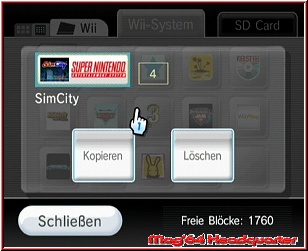 Ein weiteres wichtiges Thema zur Virtual Console betrifft das Speichern. Auch interessiert natürlich viele Spieler was mit den heruntergeladenen Spielen passiert, wenn man sie mal nicht mehr spielt. Kümmern wir uns zuerst um das Thema Savegame. Alle Spiele die in ihrem Original die Möglichkeit eines Speichers boten, bieten dies natürlich auch als VC Variante an. Schließlich handelt es sich hier um original Spiele. Im Zeitalter des internen Wii Speichers legt jedes Spiel auch ein entsprechendes Savegame an. 4 Seiten werden dafür beansprucht und tauchen im Spielstand Menu der Konsole genauso auf wie die Savegames zu aktuellen Wii Games. Einzige Einschränkung dabei ist allerdings, das sich die wenigsten Spielstand Dateien auf externe SD Karten kopieren lassen. Anders verhält es sich Gottseidank bei den Spielen selber. Diese werden ja im Hardwaremenu der Wii Konsole als eigener Kanal dargestellt, also tauchen wie der Shop Kanal als anklickbarer Punkt auf. Die Spiele selber werden auf dem Kanal Speicher der Wii Konsole abgelegt. Diese Daten die z.b. im Falle eines Super Probotector für das Super Nintendo 48 Seiten beanspruchen können nun auch auf externe SD Cards kopiert werden. Damit werden sie dort archiviert und sind nicht weg. Jetzt kann man diese im Kanal Speicher der Wii Konsole löschen. Das Spiel verschwindet auch aus dem Hardware Menu. Will man es wieder zocken steckt man die SC Karte wieder in die Wii Konsole und kopiert das Spiel praktisch zurück auf den Kanal Speicher um es nun wieder normal anwählen zu können. Wer sich also Sorgen macht, das seine Wii Kanalplätze irgendwann mal nicht mehr reichen kann beruhigt Geld ausgeben. ;-) Direkt von der SD Karte starten geht allerdings nicht.