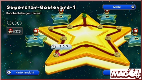 Beendet das Spiel einmal und ihr bekommt auf einer bisher leeren Insel einen Stern, der nun zum Superstar-Boulevard führt. Um die dortigen Level aber alle spielen
