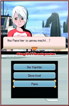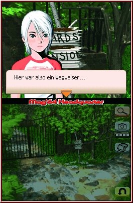 Es gibt ein paar dieser technischen Finessen, die ich als genial empfinde. Man bekommt so immer mehr eine Ahnung zu was man den DS in Zukunft alles gebrauchen kann. Aber selbst das war noch lange nicht alles. Desweiteren habt Ihr im Spiel eine sogenannte Foto Funktion, die neben der Lupe und der Tasche ebenfalls als Symbol auftaucht. So kann man z.b. in der Detailsicht auf ein Gemälde an der Wand dieses fotografieren und abspeichern. Das geniale hier ist die Möglichkeit im DAS diese Fotorubrik aufzurufen und ein Bild in den oberen Screen zu schieben und unten ein anderes aufzurufen. Jetzt kann man beide Bilder übereinander legen. Transparent und drehbar erhält man so Muster oder sieht versteckte Dinge wie Codes die man eben nur sieht wenn man 2 Gemälde so übereinanderliegend verbindet. Das hat schon was und macht zusammen mit den anderen Dingen aus Another Code fast schon einen Innovations Burner. So läuft man also durch alle Bereiche der Insel, was zumeist im Inneren einer Villa vonstatten geht. Man untersucht Dinge und löst auf vielfältige Weise die verschiedenen Rätsel. Dazu erhält man immer wieder Informationen zur Story. Sei es über Ashley, ihre Eltern oder über die früheren Bewohner der Insel. Alles paßt am Ende wie in einem Puzzle zusammen. Hier kommen nun auch die sogenannten DAS Karten dazu. Kleine wie DS Spiele aussehende Speicherkarten, die mehr oder weniger gut versteckt herumliegen und teilweise wie eine Schnipseljagd das weiterkommen unterstützen. Man kann sie jederzeit abrufen und nachlesen was drinstand. Dazu trifft Ashley im Verlauf auf diverse Personen, die sie auch begleiten und imaginär mitlaufen. Hier kommt nun noch ein weiteres Icon im Screen dazu, mit dem Ihr auf Personen klicken könnt und Gespräche beginnen könnt.