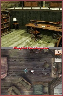 Ihr könnt wahlweise mit dem Kreuz Ashley nach allen Seiten in den begehbaren Bereichen steuern, oder aber mit dem Pen auf dem TC einen Punkt anklicken und Ashley läuft dorthin. Platziert man z.b. den Pen imaginär 1 Meter vor Ashley und zieht diesen ohne Pause in eine Richtung geht euch Ashley hinterher. Das ganze auch nicht durch Scrolling Screenweise abgehackt, sondern durch weiche Übergänge soweit Ihr laufen wollt oder könnt. Doch es geht noch viel weiter mit den wunderbar intuitiven Aktionen der guten Ashley. In der rechten oberen Ecke des TC findet Ihr ein Lupen Symbol, das beim Betreten eines Raumes oder Bereiches zunächst abgedunkelt ist. Tretet Ihr durch eine Tür in ein Zimmer so zeigt der obere Screen meist das komplette Zimmer. So erkennt man z.b. in einer Ecke des Zimmers einen Schreibtisch. Geht man zu diesem aktiviert sich an bestimmten Stellen davor die Lupe und man kann diese nun anklicken. Jetzt wechselt der obere Screen auf den Tisch selber und alles wird detaillierter und dazu auch auf dem unteren Screen so angezeigt. Jetzt kann man als Spieler alle Objekte die man sieht anklicken und untersuchen. Bei vielen Dingen die nichts bieten kommt nur eine Hinweis was es ist. Findet man im sterilen Bild aber ein nutzbares oder wichtiges Objekt wird nochmal detaillierter geschaut und das Bild wechselt erneut. Einfaches Beispiel ist wieder der Schreibtisch. Zuerst läuft man hin und untersucht diesen. Klickt man nun z.b. auf eine Schublade und diese ist wichtig wird nun die Schublade allein dargestellt und sieht darin etwas liegen. Klickt man dort nun auch nochmal drauf erscheint der Inhalt auf dem oberen Screen und man kann Objekte aufnehmen oder Schriftstücke lesen.