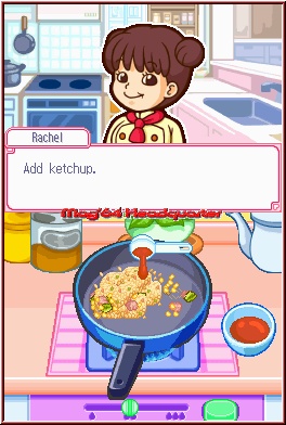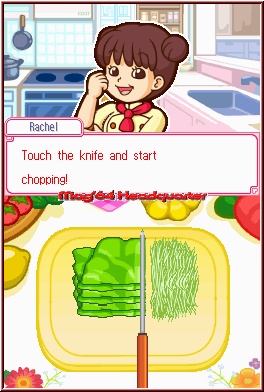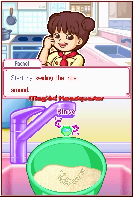 Mit dem Stylus füllt Ihr eine Schüssel mit Reis und gebt dann Wasser in den Bottich. Schwenkt die Schüssel nun durch drehende Bewegungen auf dem Touchpen, um den Reis von Rückständen zu befreien. Nun leert Ihr das weiße Gut in ein Sieb und schüttelt dieses kräftig. Weiter geht's im Reiskocher, den Ihr punktgenau mit Wasser füllen müsst - ein wenig Hühnerbrühe hinzu und eine geschnittene Zwiebel und der Reiskocher darf auf vollen Touren seinem Zweck nachgehen. Zum Schluss mit Butter, Salz und Pfeffer abschmecken und voilà - der Buttereis ist fertig! Weiter geht's mit dem Hauptgericht, einem so genannten Sahneeintopf. Schneidet mit dem Messer zunächst eine Zwiebel in Würfel, ebenso das zart rosa Geflügel. Nun berührt Ihr den Kochtopf, der sich an der Wand der Küche befindet und bratet das Gemüse ein wenig an. Ein paar geschnittene Möhren, dann das Geflügel, sowie die Zwiebeln. Nun müsst Ihr solange den Kochlöffel schwingen, bis das Fleisch seine Farbe ändert. Ein wenig Wasser und Salz dazu und einen Brühwürfel! Da das Gericht nun etwas schäumt, solltet Ihr mit einem Schöpflöffel den Schaum abnehmen, dann Kartoffeln hinzugeben, einen Schuss Milch, sowie ebenfalls eine Portion Brokkoli. Als nächstes mischt Ihr was das Zeug hält und verfeinert das Gericht mit einer anständigen Portion Sahne. Jede Zutat wird Euch direkt vor die Nase gehalten, so dass von Euch lediglich der Wurf in den Kochtopf abverlangt wird. Weil nun auch das Hauptgericht fertig ist, ist die Aufgabe weitestgehend erledigt.
