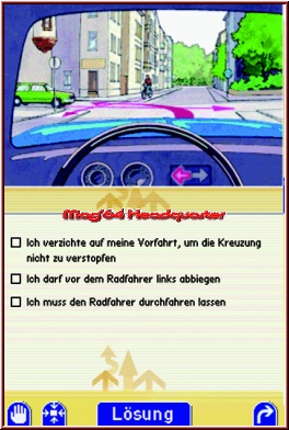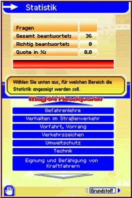 Das Herzstück von „Führerschein-Trainer" ist allerdings das Trainieren der Prüfungsbögen sowie die Prüfung an und für sich. Der übliche Grundstoff wird durch Zusatzstoffe ergänzt, so dass Ihr optimal auf die anstehende Theorieprüfung vorbereitet werdet. Was von besonderem Interesse sein dürfte, ist die Aufteilung des Lernstoffes in übergliederte Oberpunkte (zum Beispiel: „Gefahrenlehre", „Umweltschutz", „Technik", „Verkehrszeichen" etc.). Hinzu kommt die Möglichkeit, nach einzelnen Kapiteln oder aber der Fehlerhäufigkeit zu sortieren, ebenso besteht die manuelle Option, lediglich noch nicht richtig beantwortete Fragen während der Prüfung aufzulisten oder aber alle Fragen im Training zu beantworten. Habt Ihr bereits einen Fragebogen vor Euch liegen gehabt, wisst Ihr, wie der „Führerschein-Trainer" aufgebaut ist. Im Topscreen werden entsprechende Fragen beziehungsweise verdeutlichende Bilder dargestellt, im Touchscreen warten die Antworten, die per Berührung angekreuzt werden können. Zunächst wird nicht der Fehler gleich deutlich gemacht, sondern erst zum Abschluss eines Tests summiert das Programm alle begangenen Missgeschicke auf. Darüber hinaus existiert ein Lösungs-Button, der auf Knopfdruck richtige und falsche Antworten anzeigt. Jedoch sollte dies den letzten Ausweg darstellen, denn vorderhand sollte sich ein Lernerfolg einstellen, der aber nur erreicht wird, wenn man ohne Lösungshilfe an die Sache rangeht.