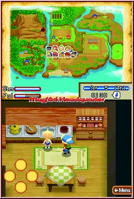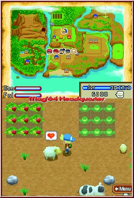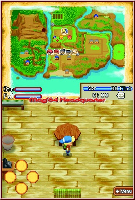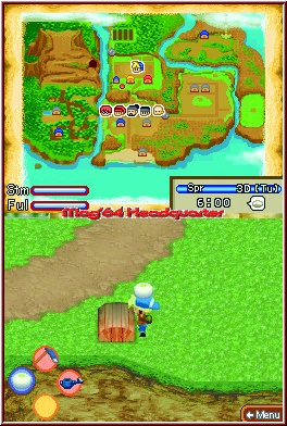 Das auch in diesem Harvest Moon Titel das Thema Heiraten auf der Tagesordnung steht, merkt man schon beim reinen Spielstart, bei dem man sich zwischen einer männlichen oder weiblichen Spielfigur entscheiden kann. "Paarungspartner" finden später beide Geschlechter mehr als genug. So erlebt man also zu Beginn erstmal die Ankunft auf der Insel und Ihr habt mit dem alten Taro einen Art Helfer und Wegbegleiter, der euch gerade zu Beginn hilfreich zur Seite steht. Anders als z.b. in der Wii Version ist die Insel des Glücks klar eingeteilt und man kann nicht wählen, wo man beginnen will. Inmitten der Insel steht euch ein eigenes Gebiet zur Verfügung, auf dem Ihr loslegen könnt. Parallelen findet man aber dennoch zuhauf. So z.b. das die Insel an sich erst nach und nach komplett begehbar sein wird. Zu Beginn habt Ihr wirklich nur Zugriff auf den Strand, einen Art Zentralbereich und eben euer eigenes Gut. Alles andere muss teilweise hart erspielt werden. Was auf einen wartet sieht man aber schnell. Denn die Screenaufteilung ist klar und gelungen. Nicht nur weil die Steuerung fast komplett auf den Touch Screen ausgelegt ist, sieht man die spielerische Action auf dem Touch Screen. Der Top Screen dient zum einen für Ereignisanzeigen oder eben die meiste Zeit zur Darstellung der Gesamtkarte der Insel. Ebenso kommen dazu wieder unterstützende Anzeigen und Infos, die zum Spielverlauf dazu gehören. Neben dem Tag, der Jahreszeit samt der Uhrzeit sind dies 2 "Lebensleisten" der Helden. Auf dem Touch Screen wiederum sorgen die Ablagen für Werkzeuge und allen Arten von Items für Einblendungen, sowie per antippbarem Feld das Inventory und Pausenmenu, das man links oder rechts in den Screen einblenden kann. Abgedeckt wird damit das Logbuch um das Spiel jederzeit Speichern zu können, sowie der Rucksack und das Inventar, auf das ich aber noch näher eingehe.