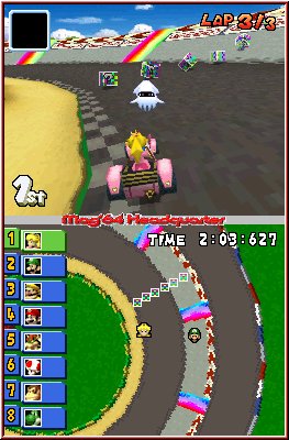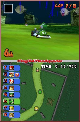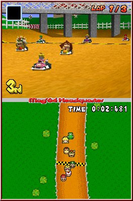 Auch grafisch ist Mario Kart DS eine echte Augenweide. Das beginnt bei der wunderschönen Nachbildung alter bekannter Strecken, die selbst im Falle der GCN Strecken wenig von ihrem Flair verloren haben. Das liegt vor allem daran das Mario Kart DS sehr satte Farben und kaum Pixelgrafiken mitbringt. Es wirkt alles für bisher gesehene DS Verhältnisse sehr edel und detailliert. Ob die Animationen der Fahrer, die Effekte der Items oder eben sehr detailliert gestalteten Karts. Dazu die Streckenführungen mit Bergauf und Ab Passagen, die wunderbar flüssig spielbar sind. Technisch keinerlei Probleme machend stimmt der Gamespeed und selbst die Hintergrundgrafiken sind perfekt gelungen. Das geht dann soweit das z.b. der Schokosumpf aus der N64 Version mit dem ähnlichen Nebeleffekt wie damals gestaltet wurde. Notwendig ist das ganze auf dem DS wie andere Strecken ja zeigen eigentlich nicht. Dazu kommen so gut wie keine Clipping Fehler oder gar eine schlechte Kollisionsabfrage. Für DS Verhältnisse Ende 2005 ist Mario Kart sicherlich ein Meilenstein, auch wenn wie in 2 Jahren vielleicht über Mario Kart DS schmunzeln werden. ;-)