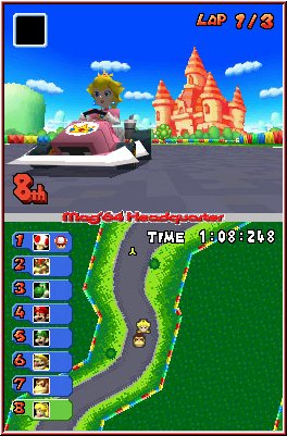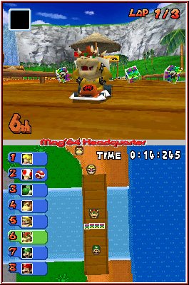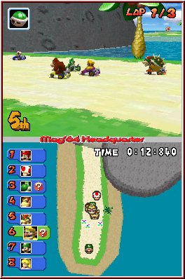 Wählt man einen Cup an zeigt man euch neben dem Namen der Strecken je eine Bildchen und los geht die Jagd nach dem Goldpokal. Alles beginnt mit einem Kameraflug um die Strecke und endet an der Start und Ziellinie. Schon hier sieht und spürt man schnell das der DS auch wie geschaffen für ein Spiel wie Mario Kart ist. Denn der Einsatz beider Screens bringt eine Menge für den Spieler. Die Sichtweise hinter dem Kart ist eigentlich wie seit Anbeginn und macht keinerlei Probleme. Desweiteren findet man auf dem oberen Screen wo die Rennaction tobt Anzeigen für die Platzierung, die Runde und das gewählte Item. Der Touch Screen wiedrrum bietet nun 2 verschiedene Setups, die man einfach per Drauftippen aktiviert. Einmal eine Gesamtkarte mit allen Charakteren als Symbole darauf und eine zweite Variante, die wesentlich detaillierter ist. Sie zeigt nur einen kleinen Ausschnitt in der Draufsicht, zeigt euch aber so alles mögliche auch an. So könnt Ihr z.b. sehen wenn jemand hinter euch einen Panzer geschossen hat und welche Bahn der nimmt, bis hin zu abgelegten Schalen. Selbst wenn ein Gegner hinter euch Mist baut wird das angezeigt und bringt einen gelungenen Ansatz mit. Dazu habt ihr eine Anzeige die euch zu allen Gegner anzeigt was sie gerade für ein Item in der Tasche haben. Ist man erster und sieht wie der letzte gerade einen Blauen Stachipanzer losschickt ist die Vorfreude doch gleich nochmal so groß. ;-)) Wie immer wichtig ist die Steuerung in einem Mario Kart. Hier findet man eine Rückbesinnung auf alte N64 Zeiten, vor allem was das Driften angeht. Zunächst gibt es wieder die einfache Einteilung. A und B für Gas und Bremse, sowie die X und L Taste um Items nach der Aufnahme aus einer Box zu stoppen und zu nutzen. Wobei punktgenau stoppen nicht möglich ist. In dieser einfachen Variante ist die Steuerung wunderbar weich und bietet keinerlei Anlaß zur Kritik. Beim Driften hat man nun wieder die R-Taste, die man drückt, dadurch springt und danach per schräg stellen des Karts und hin und her Bewegen des Steuerkreuzes in den Drift kommen kann.