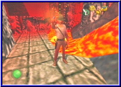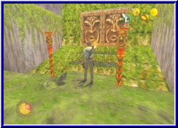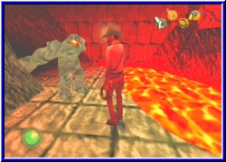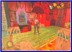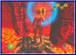 | Ich werfe hier mal eine aus Spaß. Nur um schonmal zu wissen wie fliegen und welche Power sie haben. Wow..., sie fliegen nicht so weit, haben aber eine immense Wirkung. Das ist wirklich reichlich an Explosionskraft. Hinter mir ist ein Tor das zu ist. Links kann ich mit der Machete wieder ein wenig Gras von einem Eingang schlagen und finde so einen Stein zum ziehen. Klar jetzt haben auch die komischen Zeichnung an der Wand ihre Bedeutung. Denn ziehe ich den Stein heraus kann ich diese als Kletterwand nutze und erreiche einen Schalter, der mir das Tor hier unten öffnet. Mal was neues das Schalter und Tor so leicht zu erreichen sind. Warum ist auch schnell klar. Nur einen weiteren Schatz finde ich dahinter. Aber wo muß ich jetzt hin. Denn hier geht's auch nicht weiter. Die Statue im Tempel könnte die Lösung sein. Da waren ja auch 2 Türen die geschlossen waren. Allerdings habe ich kein Schloß entdecken können. Also nochmal hin und jede Textur 2x umgedreht. Zumindest entdecke ich auf der anderen Seite der Halle eine große runde Scheibe die ich anschlagen kann und die einen fetzigen Ton hergibt. Wäre eine Möglichkeit. Trotzdem gehe ich den Weg zurück bis zu meinen viele Scorpionen, finde wenigstens ein paar Handgranaten aber sonst nichts weiter. Wieder zur Halle mit der Statue. Nachdem ich an alle möglichen Ecke eine Handgrante geschmissen habe bleibt eigentlich nur die Statue. Vielleicht muß ich sie irgendwie bewegen das sie den Lavazugang hier absperrt. Aber wie. Der rechte Arm schaut ein wenig wie ein Wegweiser aus. Ja ich weiß da ist eine Tür. Moment mal. Warum sollte mir hier nicht auch Peitsche helfen. Also seitlich gestellt und sieh an. Ich kann den Arm anvisieren . Treffe ich ihn geht in einer Sequenz neben mir die Tür auf. Wie einfach das doch sein kann. Aber wir wissen ja alle wie das manchmal ist mit den "leichten Rätseln". Also nun diese Tür und ich erreiche kurze Zeit später die nächste Lavahalle. Nimmt das eigentlich keine Ende? Auf der anderen Seite sehe ich schon wieder einen weiteren Weg der von einem Gitter versperrt wird. Oh halt, diesmal ist auch gleich hier links ein Schalter. Denke mal das der das Tor öffnet. Auch habe ich ja noch den Schlüssel. Ich frage mich ob die Handgranaten wirklich nur zum Unruhe stiften da sind oder auch um irgendwie ein Rätsel zu lösen. Tatsächlich öffnet der Schalter das Gitter, .....aber nur für eine Sekunde. Dann fällt es wieder nach unten. Indy erzählt nun auch das ihm hier irgendwas helfen muß. Na Klasse. Mein erster Gedanke war die Handgranate. |