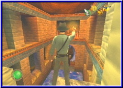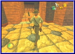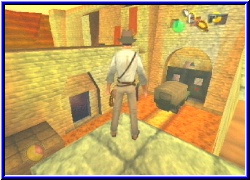 | Als drittes sehe ich...., das sieht doch aus wie.., ja das mechanische Teil das ich im ersten Level von der zarten bekommen habe. Setze ich es hier ein aktiviere ich einen Fahrstuhl und der Block auf dem wo ich heruntergekommen bis kommt ein Stückchen nach oben. Warum sehe ich auch. Denn nur so erreiche ich einen bestimmten Absatz und kurz danach eine riesige Halle mit allerlei Etagen, Vorsprüngen und wegen. Schön das diese Momente alle mit stimmiger Musik unterlegt sind und immer wieder per Sequenz gezeigt werden. Verdichtet meiner Meinung nach die Atmosphäre. Wow, wo fange ich hier an? Zunächst mal einen Vorspung nach unten. Als ich gerade auf den Boden der Halle springen will halte ich erstmal mit einer Gänsehaut inne. 5 Scorpione der große Gattung flitzen hier aus einer Ritze unter mir herum. Was für ein Anblick. Gut das die Jungs keine Wände hochkommen .So kann ich sie relativ gefahrlos erledigen und wage den Sprung nach unten. Auch diese Viecher bleiben noch eine ganze Weile liegen. Einziger Weg zunächst ist per Leiter nach oben. Dort kann ich auf der ersten Etage einen Block verschieben und ihn als Plattform benutzen. Stehe ich drauf sehe ich auch wozu. Denn in der Mitte ist auf einer Säule ein Schalter zu sehen. Nachdem ich ein paarmal zu weit gesprungen bin merke ich das es eine weitere Sprungvariante gibt. Für kleine Entfernungen. Halte ich den Z-Trigger gedrückt, laufe in die Richtung und springe jetzt macht er nur einen Hopser. Gut zu wissen. Ich springe auf den Schalter und es öffnet sich unterhalb ein Schlitz in dem Raum. Seit den Scorpionen bin ich äußerst vorsichtig. Scheint aber alles ruhig zu sein. Also krieche ich rein, jederzeit mit dem schlimmsten rechnend und was finde ich hier. Hey schau an, die goldene Statue die Simon haben wollte. Wenigstens was. Wieder raus und erneut die Leiter hoch. Über mehrere Etagen und ein paar Sprünge finde ich plötzlich ein großes Teil, das ich schon als normalen Schatz abtun will. Aber wenn ich es mir genau anschaue dann könnte es eines der Puzzleteile sein, die ich unten im Tempelraum einsetzen könnte. Denn kurz darauf finde ich ein zweites und stehe nun ganz oben, als plötzlich der Weg hinter mir zusammenbricht. Wieder nur mit dem Hopser komme ich gefahrlos nach unten. Sprünge aus der Höhe sind tötlich, glaubts mir. :-) Das dies aber auch seinen Sinn hat merke ich als der letzte Block auf dem ich ganz oben stand herunter fällt und so einen Eingang in der Wand erst erreichbar macht. Dort finde ich das dritte Puzzle. Jetzt aber nichts wie nach unten. Tatsächlich kann ich diese Teile nacheinander einsetzen und am Ende beginnt die nächste Sequenz in der Indy den ganzen Text entschlüsselt und den Weg zum nächsten Abenteuer entschlüsselt. |