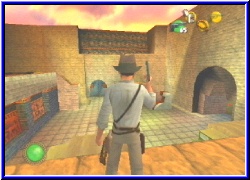 | Also wieder ran an die Konsole und weiter geht's mit dem 2. Tag in Indiana Jones. Mein Plan das vielleicht ein Continue Savegame gleich auf dem Hauptmenu erscheint schlägt erstmal fehl. Dafür wurden mir auf dem Levelbildschirm einige Dinge klar. Zum einen sieht man nun das 2. Level oben anwählbar und zum zweiten weiß ich nun das die langen Schatzleisten am unteren Bildrand immer nur für ein Level sind. Was dabei abgedunkelt ist habe ich nicht gefunden. Und sieh an, selbst im ersten Level habe ich Wege übersehen, denn gut die Hälfte der Schätze fehlt mir. Schau an, das hätte ich nicht gedacht. Die IQ Points Anzeige scheint eine Gesamtanzeige für das gesamte Spiel zu sein. Wofür das sammeln der Schätze auch immer gut ist. Wähle ich jetzt im Levelbildschirm das zweite Level an beginne ich aber nicht von neuem sondern Punktgenau an der Stelle wo ich abgespeichert habe, nämlich oben auf dem Steg vor dem Wachareal. Das ist sehr positiv. Ebenso positiv ist das ich jedes Level immer wieder besuchen kann um die restlichen Schätze zu suchen, wobei aber Sequenzen u.s.w. immer wieder erscheinen. Das habe ich bei einem Besuch im ersten Level gemerkt. Wo auch immer da noch ein Weg sein soll? Erstmal egal, ich will nun hier in Babylon weiter. Zünftig werde ich begrüßt. Nämlich mit einem russischen STOP und einem ersten kleinen Blutspritzer. So nicht Jungs! Aber übermütig bin ich mit meinem Revolver nicht. Könnte ich auch garnicht. Denn ich kann die Wachen unten nicht anvisieren. Will hoffen das ich hier noch ein paar andere Wummen finde. Also den Weg im Berg weitergegangen, an dessen Ende ich in einen kleinen mehretagigen Tempel kommen. |