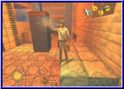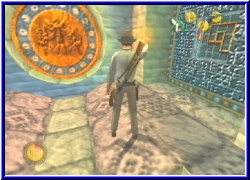 | Hätte Joanna nicht besser machen können. :-) Endlich kann ich durch dieses Tor. Ich erreiche eine weitere große Halle mit Wegen nach allen Seiten. Einer führt nach unten zu einer verschlossenen Tür. Dahinter erkenne ich jede Menge TNT. Nur ist die Tür halt zu. Ich brauche hier einen Schlüssel. Gerade als ich hoch will um mich weiter umzuschauen steht in einer Sequenz ein neuer russischer Offizier vor mir , der wieder in feinstem Akzent daherredet. Gerade als er mich umlegen will bekomme ich unerwartet Hilfe. Denn jemand streckt den Offizier nieder. Weiter per Sequenz, die nach wie vor 100% mit Sprachausgabe versehen sind stellt sich mir ein Simon Turner von der CIA vor. Nach einigen aufklärenden Worten auch zur zarten aus dem 1. Tag gibt er mir den Schlüssel, wenn ich ihm verspreche eine goldene Statue zu besorgen. Indy der Händler. :-) Na gut. Von mir aus. Danach verschwindet er und ich kann die Tür unten öffnen. Ein großer Raum mit dem schon gesehenen TNT öffnet sich. Ein bißchen erfahren in Rätseln könnte ich mir vorstellen das man sie wegsprengen muß um darunter vielleicht einen Weg zu öffnen. Die Idee sollte sich als richtig heraustellen. Nur nicht so wie ich wollte. Denn wie ich noch so in dem Raum herumstehe kommen 2 Wachen, schießen von draußen auf das TNT und ich war Geschichte. Das zur KI. Diesmal per Savegame wieder hier in dem Bereich und ich warte nun auf die beiden Dödel. Hey was ist das eigentlich? Total übersehen das der Offizier von vorhin etwas liegengelassen hat. Ein Schnellschuß Gewehr. Zwar mit wenig Schuß im Magazin. Aber eine tolle Knarre, die eine noch weitere Range als die Pistole hat und verdammt cool aussieht wenn sie Indy auf den Rücken schnallt. :-) Nachdem die Wachen nun erledigt sind springe ich in das Loch den das TNT hinterläßt und befinde mich in der nächsten Sequenz in einem tiefen Sprung in die Tiefen des Palastes. Hier muß ich mich langsam über Plattformen nach oben arbeiten um endlich wieder normales Gebiet zu erreichen. Hier kann ich mit dem Feuerzeug sogar die Fackeln anzünden. Zelda läßt grüßen. :-) Wieder muß ich einen Gang hindurchkriechen und frage mich danach erneut wie es weitergeht, als plötzlich ein riesiger Fahrstuhl mit mir nach unten fährt. Schreck laß nach. Alles per Sequenz und ich gelange unten in einen Art Tempelraum. Zumindest geht jetzt eine stimmige Hintergrundmusik los die anzeigt das wirklich etwas besonderes in der Luft liegt. Zunächst entdecke ich ein komisches Muster an der einen Wand. Sieht aus wie ein Puzzle . Indy will es lesen, aber es scheint etwas zu fehlen. Daneben ist eine goldene runde Tür, die ebenfalls Rätsel aufgibt. |