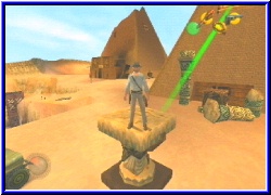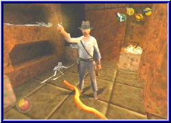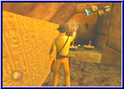 | Weiter gehts rechts von mir. Schon wieder nach oben. Also ein Etagengewechsel ist das hier. Wer weiß wo ich hier gerade bin innerhalb der Pyramide. Und vor allem wo ich wohl rauskomme. Schön finde ich immer wieder die Möglichkeit Fackeln anzuzünden um hier wenigstens etwas Licht zu bekommen. Nur meist eben erst nachdem ich kleine Viecher erledigt habe. Vorher wärs besser. Also wieder ein paar Leitern nach oben. Kurz darauf wird es wieder sehr mystisch. Ein kleiner Raum mit irgendwas auf einem kleinem Altar wartet hier. Dahinter ist eine alte Inschrift . Wie immer in solchen Momenten liest Indy dieses Teil vor, oder sagen wir besser was er davon versteht. Irgendein Licht öffnet hier alle Türen sagt Indy. Licht?? Gegenüber dem Altar ist auch ein Loch in der Wand, durch das ich nach draußen schauen kann. Ein bißchen sieht das Teil hier wie Holz aus. Vielleicht mal das Feuerzeug benutzen. Ja genau...! Denn kaum zünde ich das Holz an wird die Flamme von 4 Wänden umschlossen, wobei genau auf der Seite des Loches ein Loch in den Wänden ist, das wie ein Kristalle wirkt. Und kaum ist es umschlossen zeigt die Sequenz wie das gebündelte Licht durch das Loch nach draußen geht. Jetzt sind mir auch die Fenster ein Begriff die ich draußen immer oberhalb der Pyramiden gesehen habe. Gut zu wissen das es die überall gibt. Vielleicht muß ich hier 4 solcher Lichter aktivieren. Von der Logik her könnte das so sein. Denn die Tür mit den 4 Armen könnte so aufgehen. Vielleicht müssen sich die 4 Lichtstrahlen treffen und öffnen so die Tür. Ach es gibt viele Möglichkeiten. Aber zumindest scheint es das in diesem Tempel gewesen zu sein. Denn über ein Rutsche komme ich wieder zum Anfangsteil des Tempels. Moment mal..., da fällt mir noch ganz was anderes auf. Auf der Seite des Kristalls ist an der Wand wie ein Auge abgebildet. Genau dieses Augensymbol war unten in der kleinen Ruine zu sehen wenn ich die 3 Steine weggeschoben habe. So langsam könnte man es sich zusammenreimen. Ich will nur hoffen das ich in irgendeine der anderen Pyramiden herein komme. Hoppla.., kaum rutsche ich die letzte Ecke nach unten höre ich ein lautes Getöse, als wenn hier irgendwo ein Stein auf mich zu kommt. Ein weniger hektischer wird man schon. Aber nein, eine neue Tür ist hier am Anfang aufgegangen. Auch nicht schlecht. Wieder eine Soundkulisse, die einem die Gänsehaut über den Rücken jagd. Zunächst aber warten einige Schangen und Scorpione hier vor mir ehe ich langsam weitergehen kann. Am Ende öffne ich hier an einem weiteren Altar mit einem Schalter einen Spalt darunter zum kriechen. Schreck laß nach 4 Schlangen kommen mir hier entgegen, die auf Krawall aus sind. |