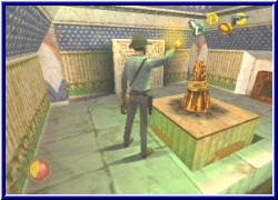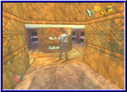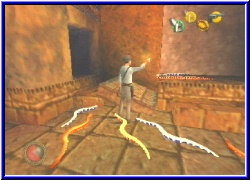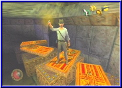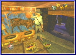 | Ein Blick von der Kante nach unten zeigt mir auch warum. Denn dort ist keine Schlucht sondern ein komplett bebautes Gebiet. Das sind ja Schienen da unten!! So langsam wirds verzwickt. Aber irgendwie erfreut dieses Level den Entdeckergeist Indy's. Direkt runterspringen wäre hier etwas tödlich. Also über einige Plattformen nach hinten und hier oben weiter. Natürlich verspringe ich gleich beim ersten mal fetzig und stürze nach unten. Was sich aber in Nachhinein als goldig herausstellte. Denn ich werde an dem Rücksetzpunkt mit dem Abgrund von eben angesetzt wo ich den Stein verschieben konnte. Und sehe doch tatsächlich doch noch warum ich hier den Stein verschoben habe. Denn jetzt ist der Fels ganz oben unter der Decke genauso hoch wie eine Kante, die ich als Kletterwand verwenden könnte. Wahnsinn! So komme ich nämlich doch auf die andere Seite zur oberen Etage und kann weiter. Also wenn ich mir überlege ich wäre vorne weiter gekommen. Denn man sollte es kaum glauben. Nachdem Indy hier eine Plattform in der Wand zerstört komme ich in den Tempel mit dem Stein den ich von außen ziehen konnte. Denn sehr viele Schlangen wuseln hier herum. Denn nachdem die alle erledigt sind sehe ich den Stein. Toll gemacht. Also habe ich nun die 2. Pyramide erreicht. Werde also nun erstmal diese untersuchen. Also ganz knusper seid Ihr nicht Factor5? Ist ja fast wie ein Zelda Dungeon. Denn auch hier gibt es wieder mehrere Wege, die vor allem wieder nach oben führen. Könnte mich aber erneut zum Licht führen! Vor allem ist hier alles irgendwie verschoben. Schiefe Wege und Fackeln die man gerade so erreicht. Aber eines kann man mittlerweile auch sagen. Wo ein Fackel ist das ist ein Weg. Auch hier ist eine bröcklige Wand. Das vorher noch ein Abzweig war erzähle da keinem. Man kommt irgendwie vom hundertsten in's tausendste. Trotzdem ziehts mich irgendwie nach oben. Das ist neu. Diesmal kann ich nur einen Spalt freisprengen, keinen Weg. So ganz klar ist mir aber nicht wofür. Für einen Lichtstrahl glaube ich kaum. Wir werden sehen. Also weiter nach oben hier. Traumhaft! Kurz darauf erkenne ich oben schon an den Texturen wo ich bin. Tatsächlich erreiche ich ein zweites Licht und kann wieder ein Feuer und eines dieser Augen aktivieren. Ich bleibe dabei. Wenn alle 4 Lichter aktiv sind und das Auge in der Ruine bestrahlt wird geht die Tür mit den 4 Armen auf. Da würde ich jetzt drauf wetten. Sehr beruhigt gehe ich wieder zurück und schaue den anderen Weg an. Trotzdem habe ich keinen Schimmer wozu ich den Spalt kurz vorher in die Wand gesprengt habe. Oder doch? Denn unten im Hauptraum bei den Schlangen ist in einem der kleinen Tempelzimmer ein Loch und ich komme hinein um einen Schatz zu holen. Obwohl das ganze weit auseinander ist. |