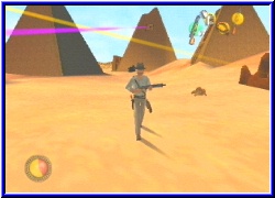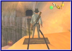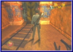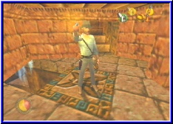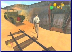 | Mein erster Gedanke Die Uhr könnte damit was zu tun haben ist ein wenig abwegig. Aber probieren muß man hier alles. Moment...., Prisma,...Kristall,....blinkendes etwas in der Schlucht hinten nach den Schienen die zerstört waren. Könnte zumindest sein. Nur wie komme ich rüber? Mittlerweile bin ich schon so ratlos, das ich einfach nur noch mit dem Auto rumfahre und versuche alle Raubtiere und Scorpione zu erlegen. Eher als Frustabbau gedacht fahre ich so umher als plötzlich, beim Überfahren eines Raubtieres plötzlich die Musik festlich wird. Das ist neu! Musik bei den Raubtieren. Das muß doch einen Sinn haben. Wenn ich euch sage das dies die Lösung all meiner Probleme hier ist werdet Ihr sicher schmunzeln. Wieder so ein Rätsel das, wenn man es weiß logisch ist. Denn jetzt wo alle Raubtiere und Scorpione erledigt sind kommt doch tatsächlich der kleine Junge aus der Pyramide. Das kann doch nicht wahr sein! In einer kurzen Sequenz sehe ich ihn runter zur Schlucht mit den kaputten Schienen laufen . Sofort hinterher. Kurz darauf erreiche ich diese Stelle und es beginnt zunächst die normale Sequenz in der Indy drüben irgendwas sieht. Nichts neues. Nur das diesmal eine 2. Sequenz folgt in der der kleine Junge über den Berg gesprungen kommt und anfängt mit Indy zu reden . Indy ist natürlich an dem blinkenden Ding da drüben interessiert. Schon kurios. Der kleine Racker könnte Indy helfen. Aber nur für eine Gegenleistung. Er möchte etwas haben. Na ebend mensch. Kaum denke ich nach was er haben möchte schon gibt im Indy die Uhr, oder zumindest will sie geben. Auch Indy ist ein Schlitzohr und möchte zuvor das blinkende Ding da hinten haben. Na schau an, als wäre es das leichteste der Welt stolziert der kleine Junge auf die andere Seite über die eine intakte Schiene und holt mir ein Kristallauge. Ich sage nur Prisma!! Es folgt ein Tauschgeschäft. Ich habe was ich brauche!! Der kleine verabschiedet sich und verschwindet. Gut gemacht Kumpel. Jetzt aber. Gleich hoch zur nächsten Statue. Ich setze das Auge ein und...... jawoll...., die Statue dreht sich und im Anschluß verschwindet einer der 4 Arme . Endlich!!! Ich habe schon bald nicht mehr dran geglaubt. Die folgenden Schritte könnt Ihr euch denken. auf zu den anderen 3 Statuen. Wenn ich mir überlege das ich dieses Rätsel mit dem Prisma schon ganz am Anfang hätte lösen können. Aber da hätte ich wieder gerätselt was der kleine will und wofür ich das Prisma gebauchen könnte. Es ist egal wie rum. Hauptsache ich bekomme diese Arme weg. Denn am Ende öffnet sich diese Tür die mich hier solange beschäftigt hat. Drinnen sehe ich auch schon das die Schienen im Tempel nicht umsonst da sind. |