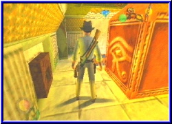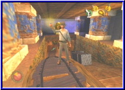 | Wieder flitze ich alle möglichen Wege ab bis ich anfange mir ungefähr ein geistige Karte zu zeichnen in welcher Richtung ich laufen könnte und müßte. Nach unten ist klar, aber dann.... So führt mich mein Weg erneut zur großen Schlucht an der Seite. Neues ist hier nichts. Aber irgendwie rede ich mir ein vielleicht mit dem Raketenwerfer irgendwo ein Loch in den Berg zu schießen. Oberhalb ist nichts. Also nochmal nach unten in die Schlucht. Auch hier entdecke ich nichts besonderes. Jetzt wo hier Schienen scheinbar eine Rolle spielen in dem Level gehe ich nochmal zur Lore die hier im Sand liegt und untersuche sie nochmal ganz genau. Hoppla,... was bekomme ich denn da! Sie liegt auf der Seite und ich kann ein Rad der Lore an mich nehmen. So langsam setzt sich bei mir der Gedanke fest hier selber mit einer Lohre zu fahren. Wozu sonst brauche ich ein Rad. Klar im Tempel sind ja Schienen, warum da nicht irgendwann langdüsen. Wenn ich nur diesen verdammten Eingang finden würde. Wieder gehe ich zurück und versuche jetzt ein wenig meine Wege zu rekonstruieren. Bis mir eine Stelle einfällt. Nämlich eigentlich eine Stelle, an der ich nur einen Schatz gefunden habe. Dort mußte ich dafür nur ein Loch inmitten eines Raumes sprengen um in ein Art Raum im Raum zu gelangen. Dort war ein Schatz. Jetzt wo ich wieder hier bin fällt mir auf das Musik beginnt sobald ich ihn betrete. War das gestern auch schon? Als ich in diesem Raum nach oben schaue sehe ich doch tatsächlich einen Weg . Ich bin total verdutzt. Ich habe da gestern zwar nicht hochgeschaut, aber kann mir nicht vorstellen das so dermaßen übersehen zu haben. Obwohl in diesem Spiel nichts unmöglich ist. Ich kann hier wirklich hochklettern und komme in einen Vorraum mit mehreren Wegen und einem Symbol am Boden das ich aber genau kenne. Nämlich seid der Schlange ein bekanntes Symbol mit dem ich mit dem 3. Machine Teil fliegen kann. Ich bleibe dabei, dieses Level ist bis jetzt die Krönung. Allerdings kann ich noch nicht nach oben. Es versperrt noch ein Brett den Weg Aber da bleiben ja noch die Wege hier, in denen ich wohl das Teil irgendwie wegbekomme. Wetten ich bin schon im Tempel mit den Schienen. Irgendwie fühle ich das. Ein Weg führt mich nach oben. Also gehe ich den erstmal. Fetziges Zeitchalterrätsel kurz danach. Für einige Sekunden bekomme ich ein Trittbrett auf dem ich mich umdrehen muß um schnell eine Etage nach oben zu kommen. Dort wirds nicht besser. Denn hier finde ich den Schalter um unten das Brett wegzubekommen. |