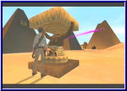 | Danach muß es wie ich merke auch sehr schnell gehen. Denn über 2 jetzt erscheinden Fahrstühle komme ich wieder runter. Allerdings habe ich mir sehr viel Zeit gelassen. Kaum unten angekommen ist das Brett wieder zu. Also auch wieder ein Zeiträtsel. Positiv ist aber die Tatsache das dies der 2. Weg ist den ich hier unten gesehen habe wo ich jetzt wieder rauskomme. Also ein klares Rätsel. Muß ja auch mal sein. :-) Also wieder den Weg und ab gehts in schwebendem Zustand nach oben. Na da schau her. Der Raum mit dem 4. Licht wartet ganz oben. Das Holz ist hier vorhanden und ich kann es auch aktivieren. Oh es wird. Alle Lichter aktiv. Wieder nach unten und raus hier. Schnell zur Ruine geflitzt wo das Licht auch hinzeigt und die Plattform freigelegt. Kaum passiert und auch sie fährt nach oben. Tolle Sache. Nur leider mit einem Haken. So schön das ist alle 4 Lichter angebrannt zu haben, so blöd ist es weil der 4. Strahl nicht funktioniert. Der Rote geht immer noch in den Sand den ich hier rausholen muß. Ich habe zwar einen Hinweis weil eine Furche zur Pyramide geht und dort ein Art Tor zu sehen ist. Aber Indy reagiert dort nicht. Weder Handgranaten oder der Raketenwerfer noch der Urgon vermögen hier was zu reißen. Auch das wäre logisch. Tür auf, Sand fließt rein und legt die Statue frei. So in etwa könnte es funktionieren. Vielleicht habe ich drinnen einen Weg übersehen. Soll ja vorkommen. :-) Also gehe ich nochmal in diese Pyramide. Schon beim reingehen über den Weg wo ich am Anfang rein bin fällts mir ein. Könnt Ihr euch noch an die kleine Wasserstelle erinnern? Dort wo zwar ein Schalter zu sehen war, aber ich nichts machen konnte. Die Lösung des Rätsels um die 4. Statue. Denn dort und das sage ich wieder als Hinweis für alle die das Spiel zocken wollen muß man an einer ganz bestimmten Stelle stehen und kann den Eimer jetzt oberhalb an einen Haken hängen. Jetzt aktiviert Indy hier einen Brunnen, der draußen in der Furche Wasser einfüllt. Aber von wegen Sand weg. Nein, jetzt ist alles voll Wasser und der rote Lichtstrahl wird gebrochen und zeigt wo völlig anders hin. Dort aber kann ich auch die 4. Statue aktivieren. Kompliment Factor5. Die Wasserstelle hatte ich echt schon wieder fast vergessen. Was ich aber nicht verstehe, warum die Tür mit den 4 Armen immer noch nicht auf ist. Denn das war eigentlich meine große Hoffnung. Man, nun sind schon alle 4 Statuen sichtbar und wieder kein Ergebnis. Das einzige was mir ein wenig Hoffnung macht ist Indys Spruch vor jeder Statue, er bräuchte ein Prisma. Zumindest deute ich sein Genuschel mal so. Prisma? Woher nehmen. |