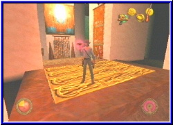 | Also lege ich einige Schlangen um damit ich hier nicht überrascht werde und erkunde ein wenig dieses Ratssaal hier. Unten erkennt man wie ein Art Rednerpult. Hoppla, auf dessen Rückseite ist ja ein Schalter. Ich drücke ihn und direkt über mir fährt eine Statue etwas nach vorn. Komisches Teil. Was es rechts an der Seite hat? Aber eine gewisse Logik erscheint mir doch. Denn ein weiteres Stück rechts ist eine kleine Plattform. Vielleicht muß ich da rüber springen? Hier unten kann ich nach hinten gehen und einen langen Gang links und rechts abgehen. Wieder diese Spinnen, die hier auch noch aus den dunklen Ecken geflitzt kommen. Links kann ich mich über einen Haken nach oben ziehen und komme oben über der Statue wieder raus. Schließlich stehe ich direkt über der Statue und ein letzter Sprung nach links bringt mich auf die Plattform in der Luft die neben der Statue hängt. Kaum draufgesprungen sagt Indy das die Peitsche hier wohl helfen wird. Mein erste Gedanke war ja rüberhangeln in alter Manier, denn das Teil an der Statue sieht aus wie ein Haken dafür. Aber er peilt es nicht an. Etwas verdutzt probiere ich es so zu treffen und hey....., das Teil fällt nach unten. Was ist das? Ich auch runter und Indy erkennt es als mechanischen Arm. Ach na eben. Das ist das fehlende Stück für den Antrieb hinten im Tor. Oh gut!! Wäre eigentlich mein nächster Weg. Aber nun will ich doch noch wissen was unten nach der Leiter kommt. Also klettere ich erstmal dort nach unten. Unten angekommen liegt ein langer Gang mit sehr reich verzierten Bodenplatten vor mir. Gerade als ich loswill bekomme ich einen riesen Schrecken. Das sind keine Bodenplatten, das sind WIPPEN !!! Hossa, Geschicklichkeit ist Trumpf. Je nachdem wo ich stehe neigen sie sich. Und das nicht schlecht! Endlich drüben und einige Pulsschläge höher. Damit habe ich nun nicht gerechnet. Drüben ist nur ein langer Gang in dem ich einen Steinblock sehe mit dem Flugbuttonsymbol. Scheint doch eine tiefere Bedeutung zu haben. Aber ich kann ihn nur ziehen. Wozu? Wer weiß, vielleicht ,lege ich damit einen Weg dahinter frei. Erscheint mir zumindest logisch. Also wieder zurück über die Platten und nun ab zum Tor mit dem Mechnismus. Kaum in der erste Halle wo ich die Abkürzung nehmen will und ein zünftiges STOI erhallt hier. Na klasse. Na Jungs,... auch schon da? Na das wird wieder was. Also nichts mit durchrennen bis zum Tor. Mal sehen wie und wo sie lauern? Nicht gerade wenige. 4 Mann allein zwischen den Säulen. Hat aber auch seinen Vorteil. Denn so komme ich wieder an ein bißchen Munition. Schon tödlich aus nächster Nähe die Shotgun einzusetzen. Endlich wieder am Tor setze ich den Arm ein und kann nun über den Hebel das große Tor öffnen . Oh wichtig. |