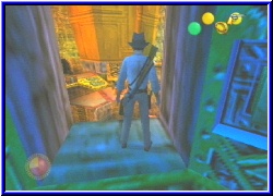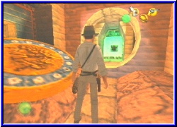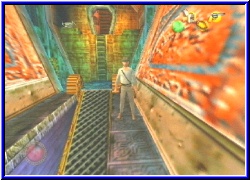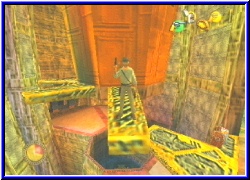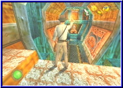 | Am Ende fährt ein Fahrstuhl mit mir nach oben und ich stehe nun direkt unter den Buttons. Vom schnellen Blick wars das hier. Also werde ich wieder etwas genauer alles absuchen müssen. Schon schlau gemacht. Jetzt wo der Fahrstuhl nach oben gefahren ist kann ich unten wo er vorher war nach unten springen und einen Schalter drücken. Und schon geht mitten in der Halle eine lange Treppe nach unten auf. Wieder nach unten!! Was auch sonst. :-) Oh man..., Indy ist am Ziel seiner Wünsche. Zunächst zunächst. Denn unter feinster Musik betritt Indy eine große Halle und vor ihm sieht er das Gebilde der Infernal Machine. Phantastisch gemacht. Allerdings geht die Geschichte weiter. In einer sehr langen Sequenz erscheinen plötzlich oberhalb auf der anderen Seite Simon und Sophia . Simon setzt eines der Teile in ein Schaltpult ein und plötzlich beginnt die Machine zu arbeiten und ein Warp Block wird von oben heruntergelassen. Die beiden diskutieren lange miteinander bis sich Indy plötzlich von unten meldet. Beide nun entdeckt zeigt sich wer hier der Bösewicht ist. Simon Turner stößt Sophia plötzlich in den Warp Block, der das Tor zu einer anderen Dimension öffnen soll. Sophia ist gefangen, was vor allem soundtechnisch sehr gelungen ist, da sie sehr verzerrt spricht. Simon schnappt sich erneut das Teil aus dem Schaltpult und Sophia wird samt dem Warp Block wieder nach oben gefahren. Simon haut ab und Sophia schreit um ihr Leben. Tja Indy jetzt heißt es wieder den Helden spielen. Denn ich muß Simon finden um Sophia zu befreien und die Machine anders zu nutzen. Das kann was werden. Denn schon auf den ersten Blick offenbaren sich hier unzählige Wege. Nach unten kann ich gehen und logischerweise die halbhohen Wege und Etagen, wo auch Simon verschwunden ist. Irre gemacht. Von der Atmosphäre her ganz toll. Auch neue Gegner erwarten Indy. Aus der Luft kommen kleine Energiebälle die Blitze in Richtung Indy schießen. Und unten entfernt sehe ich auch irgendwas herumlaufen. Aber ich erkenne nicht was es ist. Sowas liebe ich ja. :-) Wow, dann wollen wir doch mal schauen wo wir lang können. Zumindest gelange ich über einen Seitenweg direkt bis zum Schaltpult . Hier könnte ich auch eine Leiter nach ganz unten nutzen. Und noch mehrere Türen sind hier, wobei aber nur ein zu öffnen geht. Schreck laß´nach. Aus einem dunklen blauen Gang erscheint das was ich wohl ganz unten gesehen habe. Kleine Viecher mit Zacken auf dem Rücken, die mich hier angreifen. Na aber Hallo! Als wenn die bekannten nicht schon gereicht hätten. Hier gehe ich aber erstmal weiter. Aber nur ein kleiner Raum mit 2 Schaltern, die aber beide verschiedene Symbole tragen. |