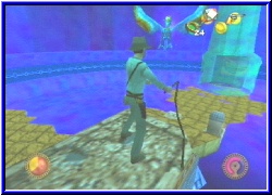 | So meine lieben Leser. Dieser Tag beendet das Testtagebuch zu Indiana Jones. Denn das Ende in diesem Level stellt für mich auch das Ende des Spiels dar. Überraschend und mit einem Hauch eines Geheimnisses könnt Ihr euch euren Teil denken wenn Ihr diesen Tag zu Ende gelesen habt. Wer aber jetzt denkt Indy wäre schnell schnell zu ende gespielt um Conker in den Schacht zu lassen dem kann ich sagen - weit gefehlt. Conker spielte heute Nacht keine Rolle. Dafür hat das letzte Level in Indy gesorgt. Oder sagen wir am Schluß besser das Ende des Levels. :-) Zunächst jedoch begann das Level in der schon angesprochenen anderen Dimension, was mir schon bei der Vorsequenz gezeigt wurde. Sophia wurde samt Block in eine große Halle gebeamt und dort von 3 großen Energiefeldern gehalten. Indy fliegt hinterher, aber hindurch und ganz nach unten in die Unterwelt. Umgeben von zerrenden und quietschenden Geräuschen finde ich mich hier nicht in einem Level wie gewohnt wieder, sondern frei schwebend in einem Bereich voller Gänge. Das ganze sieht nicht nur grafisch sehr imposant aus, sondern gibt ein beklemmendes Gefühl. Jede Sekunde denkt man hier explodiert oder verschmelzt gleich alles. Alles ist irgendwie in Bewegung. Zumindest erkenne ich unter mir viele kleine Wege und Gänge. |