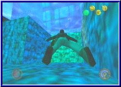 | Aber irgendwas muß es doch verdammt nochmal geben. Zumindest aus Blödsinn versuche mal weiter wegstehend mit der Peitsche auf den Schatz zu zielen. Und siehe da er springt aus der Fassung und ein Stück in meine Richtung. Kurz darauf rollt das Fass nach und ich merke was ich mich hier immer getötet hat und kann diesen Schatz zumindest einsammeln. Der andere oben läßt sich aber nicht mit dieser Taktik holen. Aber weiter geht's deswegen hier auch noch nicht. Also liebe Leser. Was nun wieder folgte war eine Odysse der Suche nach irgendwas. Nach einer guten Stunde und allen möglichen Suchen habe ich die Lösung gefunden. Gestern wo die beiden Leitern in dem Nebenraum waren führt mich eine Leiter zu einer verschlossenen Tür. Hier muß ich mich auf eine bestimmte Stelle auf dem Bett stellen und ich kann mich auf einen Querbalken ziehen. Auf diesem gelange ich praktisch über die geschlossen Tür in das Zimmer dahinter. Oh Gänsehaut. Musik beginnt wieder mächtig auf die Drüsen zu wirken und ich finde einen Schlüssel in Plusform und weiß wohin der Paßt. Aber es wird noch besser. Plötzlich beginnt eine weitere Sequenz und russische Truppen kommen durch das Haupttor. Jetzt wirds sicher fetzig. Aber sehr gut eingefangen die Stimmung. Jetzt heißt es wieder überall aufpassen. Also wieder zur Gondel wo ich oben zu dem großen Tor kam. Also wieder zunächst in den Raum mit dem Becken. Und dachte ich es mir doch. Russische Wachen. Na klasse. Wieder in feinstem Akzent wird mir "Stop Du kaptitalistischer Eindringling" zugerufen. Das klingt aber auch zu geil. Das ist allerdings das letzte was er sagt. :-) Draußen am Becken warten noch 3 andere Schlingel. Das Gewehr war ja schon richtig eingerostet. Nur arbeitet es wieder. Einen nächsten Schreckmoment habe ich als ich mich zur Gondel bewegen will und ein Spinne am Boden mich erwischt. So, jetzt krabbeln wir also nicht mehr von der Decke. Tolles Ding. Wieder vergiftet. Aber zum Glück habe ich noch genug Gift Kits. Am Ende wieder in die Gondel und nach oben. Jetzt bin ich aber gespannt was hinter der Tür lauert. Ihr auch? :-) Keine Sorge. Aufhören tue ich hier hier nicht. Die Tür geht auf und als erstes sehe ich entfernt wieder einen Medusa Kopf . Vielsagend. Unter mir mehrere Etagen und ein weiteres Becken am Ende unten. Viele verschieden hoch angebrachte Plattformen aus der Wand. Ich sehe schon das wird wieder so eine Sprungarie der übleren Art. Links ist zu weit und auch zu schräg. Denn Indy hält sich selten fest wenn man eine Kante schräg anspringt. |