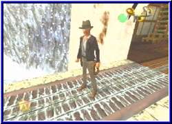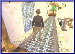 | Aber ich komme maximal 2 nach oben, was immer noch nicht reicht um die unterste der beiden beweglichen Plattformen zu erwischen. Tolles Ding. Nun läuft hier alles und ich komme nicht hoch. Aber irgendwas muß es ja geben. Nur was? Ja ja man sollte nie Wirkung der Peitsche unterschätzen. Im dunkeln erkennt man nämlich auf der einen Plattform oberhalb einen Pfahl in der Wand der mich nach oben bringt. Natürlich muß ich jeweils noch die beiden Plattformen hinter mich bringen was wieder gewisse Ohnamchtsmomente auslöst. Endlich wieder ganz oben. Ahhh, mein geschobenes Zahnrad steht auch richtig und man hört richtig wie die Uhr arbeitet. :-) Oben an der Uhr läuft diese nun. Und schau an. Ein Weg an der Seite läßt sich nun per Schalter öffnen. Tolles Ding. Aber ich will erst wissen was oben die Statue macht. Außerdem war auf halber höhe noch ein Schalter. Und schau an alles scheint auf einmal zu funktionieren. Mit dem einen Schalter lasse ich querstreben erscheinen und komme hier an einen weiteren Schatz. Ganz oben kann ich jetzt per Schalter das Tor öffnen wo die Schienen nach außen führen. Irre. Wo geht es dahin? Zunächst aber noch den Schalter für die Statue oben auf den Schiene aktiviert. Das gibts ja nicht. Unten um die große Uhr sind viele kleine Pflöcke . Jeweils einen der 12 für eine volle Stunde lasse ich dort erscheinen. Ist nun der kleine Zeiger auf diesem Pflock bewegt sich plötzlich die Statue oben. Warum fährt sie nicht? Erstmal egal. Gehe ich einfach mal nach drüben. Schon auf der Brücke sehe ich schräg unten wieder ein Fenster auf einem Vorsprung. Oben gehe ich hinein und entdecke erneut einen Turm mit vielen Etagen nache unten. Links ist auch hier eine Hebel der ebenfalls ein Bild der Statue dahinter hat. Hängt das also zusammen. Klar die Schienen führen ja hier rüber. Wie komme ich nach unten? Moment, was ist dort rechts. Ein riesiges Tor versperrt durch einen großen Riegel. Der Ausgang des Levels? Ein Versuch den Riegel wegzubekommen scheitert klägich. Hier in der Mitte ist ein Seil zu sehen. Was wohl dranhängt? Nach unten scheine ich von hier aber nicht zu kommen. Auch wenn ich eine Menge Leitern sehe. Aber die klappen nicht nach unten. Vielleicht die Plattform draußen. Logisch ist ja auch eine Etage tiefer. Genau. So komme ich eine Etage tiefer wieder in den Turm und kann nun locker nach unten springen. Eine Glocke!!! Ein riesige Glocke. Als Indy sie genau inspiziert fällt der Satz das er damit den Master ruft. Welchen Master? Hier unten bekomme ich nun die Glocke nach oben an das Ende der Schienen und die Leitern kann ich aktivieren. |