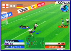 Man kann während des Trainings den Freistoß- oder Eckstoßschützen ändern. Dazu wird von jedem Spieler das leistungsspektrum angezeigt. So sollte der Freistoß Experte eine gute Curve Wertung haben um ordentlich Effet dem Ball mitzugeben. Man sollte auch schon beim Training seine Formation im Kopf haben um zu üben wo sich wer befindet. Was nutzt es, wenn man sich mit einer 3-5-2 Aufstellung vertraut gemacht hat und später zum 3-4-3 wechselt. Also gleich Nägel mit Köpfen machen. Hat man sich nun endgültig für eine der drei Steuerungungsmodis entschieden und mit den trickreichen Feinheiten der Spieler vertraut gemacht, sollte man langsam in ein Vorsaisonmatch starten. Dort hat man die Auswahl zwischen einem einzelnen Match oder einer Miniliga. Bis zu 8 Teams wählt man aus und spielt jeweils einmal gegeneinander. Hier kann man noch schön testen und probieren. Bevor es aber aufs Feld geht, stellt man sein Team taktisch ein. Der Strategiebildschirm läßt keine Wünsche offen. Von der Formation über die Spieler bis zu deren genauen Positionen und taktischen Marschrouten kann man alles verändern. Spielt man mit Mann- oder Raumdeckung? Wer ist im Spiel Kapitän und wer tritt die Eck- und Freistöße? Das sollte man vorher festlegen. Mit Start Game geht es hinaus. Nun bekommt man noch einen kleinen Statusberich vom Wetter, welches erheblichen Einfluß auf das Spielgeschehen nehmen kann, Tageszeit und Austragungsort . Schon beim Einmarsch der Spieler ins Stadion, wo eine fantastische Stimmung herrscht überkommt einen die Lust zum spielen. Die Umsetzung der Bewegungen, der Ausdruck der Spieler ist super geraten. Nach der Seitenwahl wird es langsam ernst. Die Reporter, die uns durch das Spiel führen, sind Gott sei Dank nicht sehr geschwätzig. Ihre Kommentare belaufen sich auf das notwendigste und dadurch bleiben wir vor unbeliebten Satzwiederholungen verschont. Da die Sprachsamples auch noch in Deutsch sind, ist es fast perfekt. Wer versäumt hat, im Strategiemenu die Kameraeinstellungen zu ändern oder es vorzieht es vor Ort zu machen, gelangt über das Pausenmenu dahin. Ob nun die vertikale oder horizontale Einstellung besser ist, muß man selber entscheiden. Genau so, wie die Höhe und der Zoom der Kamera. Im Hintergrund kann man die jeweiligen Veränderungen beobachten. Im Spielbildschirm sehen wir oben links die Flaggen der beiden Teams und den momentanen Spielstand. Rechts daneben die Uhr und die Bezeichnung der Halbzeit.