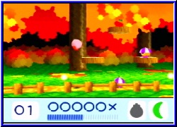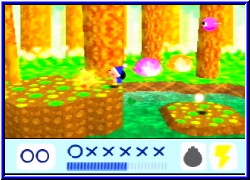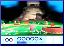 Was mir schon beim ersten Einschalten gefallen hat war die Prozentanzeige. Ich mag sowas einfach. Nicht erst seit Donkey Kong mit seinen 101%. Das bei mir nur eine 65% Anzeige steht, obwohl das Spiel durchgespielt ist soll euch schonmal zeigen das in dem Spiel mehr steckt als nur ein wenig herumzuhüpfen. Nach dem Spielstart beginnt in einer langen Sequenz die Story des Spiels, die euch den Hintergrund näher bringt. Hauptteil des Spiels sind wie der Name schon sagt kleine Kristalle, die Crystal Shards. Seinerzeit wurde ein einziger magischer Kristall auf einem fröhlichen und glücklichen Planeten umsorgt. Verantwortlich dafür waren kleine niedliche Feen, die wohl eher ein Zugeständnis an die japanischen Spieler sind. Man schaue nur auf die Augen. Eines Tages wird dieser Planet, der die Form eines Herzens hat von einer bösen schwarzen Macht heimgesucht. In einer letzten Flucht versucht die Fee Ribbon mit dem Kristall zu fliehen, wird aber im Weltall abgefangen und der Kristall zerspringt in unzählige Teile, die nun auf verschiedene Planeten fallen. Hier kommen nun die anderen Charaktere in's Spiel. So fallen einige der Kristalle auf die Planeten der Charaktere. Die kleine Fee versucht nun verzweifelt alle Kristalle wieder einzusammeln und findet schließlich ihren und unseren Helden - Kirby. Zusammen mit ihm macht sie sich nun auf den Weg nach den verlorenen Kristallen und begegnen auf ihrem langen Weg den anderen Charakteren. Und schon seid Ihr mittendrin im Spiel. Kirby ist im Grunde ein Jump'n Run, das durch viele Besonderheiten auffällt. Die erste ist das die Wege fest vorgegeben sind. In einer 2 ½ D Ansicht bewegt Ihr den Helden durch fest eingestellte Wege, die sich im Verlauf aber in alle Richtungen verschieben. Das ist wirklich technisch sehr schön gemacht und stellt auf dem N64 ein Novum dar. Mal lauft Ihr im Halbkreis, mal geht es nach oben oder es geht imaginär in das Bild oder auch aus ihm heraus. Gesteuert wird Kirby deshalb auch mit dem Steuerkreuz was sich bei der Tastenbelegung ebenfalls auswirkt. Ziel ist es auf jedem der Planeten alle Kristalle einzusammeln. Jetzt beginnt so langsam der Tiefgang im Spiel. Auf den folgenden 6 Planeten muß sich Kirby immer jeweils durch mehrere Unterlevel kämpfen, die alle nicht nur grafisch sondern auch vom Leveldesign ein bestimmtes Thema bieten. Bevor Kirby ein Level betritt wählt Ihr dieses auf dem Levelbildschirm aus. Fährt man mit dem Zeiger über eines der Bilder, das jeweils immer ein Level darstellt erscheint eine Anzeige mit gefüllten oder leeren Zeichen.