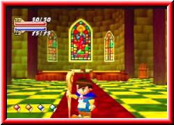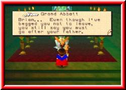 | Dessen Auftrag und Spielziel ist es das Eletale's Book zu finden, seinen Vater zu retten und damit Cetland vor einem Unheil zu bewahren. Und hier beginnt für uns das Spiel. Ihr schlüpft in die Rolle des Brian und taucht ein in die Welten von Cetland. Zu beginn befinden wir uns im Turm des Klosters Melrode und werden vom Oberhaupt des Klosters Grand Abbott auf die kommenden Aufgaben eingestimmt. Das erste Gespräch. Logisch das die Konversationen in Englisch ablaufen. Danach gehe ich einige Treppen hinunter. Niedlich ist unser Held animiert. Von Augenzwinkern bis zu schnellem Trippeln reichen seine Animationsphasen. Gefällt mir. Zwei Dinge erinnern mich sofort an Mario 64. Zum einen kann man die Geschwindigkeit des Laufens mit dem Stick verändern und zum anderen zieht Brian Staubwolken beim laufen hinter sich her. | ![]() |