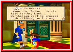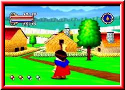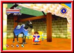 | Momentan habe ich 50 von 50 Lebenspunkten und 15 von 15 Magiepunkte. Die Brote die ich hier gefunden habe haben einen Wert von 50 und 100 Punkten. Ich glaube die werden nochmal wichtig sein. Ich verlasse das Kloster und mache Bekanntschaft mit der frischen Luft. Ähnlich wie in Mario 64 habt Ihr völlige Bewegungsfreiheit. Was mir gefällt ist die Musik. Sie paßt gut zum Spiel. Ein bischen mystisch, aber beschwingt. Ich gehe einfach mal rechts am Kloster vorbei und erreiche einen Stall. Neben einem Pferd liegt ein Haufen Stroh. Oh was ist das. Kleine Bläschen steigen auf. Beim näheren hingehen erscheint über Brians Kopf ein Fragezeichen. Ich drücke den A-Knopf, was gleichbedeutend mit einem Schlag von Brian's Stock ist und ein Symbol in Form der C-Knöpfe erscheint. Dies sind die Symbole unten links im Bild. | ![]() |