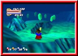 | Nach ein paar Kämpfen gelange ich an die Spitze des Berges. Oben angekommen sehe ich einen runden Platz vor mir der von großen Steinblöcken umgeben ist. In der Mitte sehe ich ein paar kleine Steine die eine Art Eingang bilden. Wo geht es hin? Unter Wasser! Denn ich finde mich auf dem Grund des Meeres wieder. Grafisch toll umgesetzt. Man sieht überall kleine Felsen und Hügel im Wasser. Wer weiß wie weit ich hier laufen muß. Zuerst kann ich aber nur auf schmalen Pfaden entlanggehen. Die Spannung steigt. Die Pfade winden sich um die Felsen nach oben so das man sich jederzeit erschrecken kann wenn hinter der nächsten Ecke einer lauern würde. Aber ich muß hier nicht kämpfen. Und da ist das Ziel meiner Reise. Ich sehe den Dieb auf einem runden Areal stehen. Nach ein paar "netten" Worten geht's auch schon los. | ![]() |