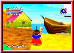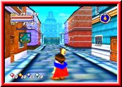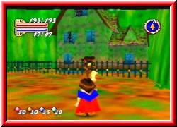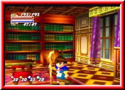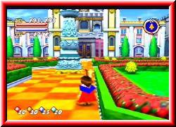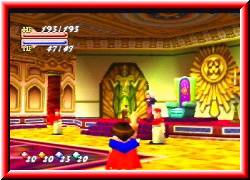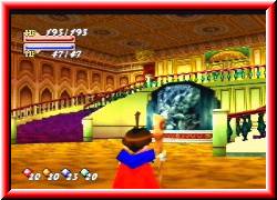 | Eine große Vorhalle die bis jetzt in dem Ausmaß auf dem N64 seinesgleichen sucht. Überall herrliche Muster an der Wand und Decke. Kerzenständer, weiche Farben die herrlich ineinander verlaufen. Ich könnte hier ins Schwelgen geraten. Das muß man einfach gesehen haben. Das wirkt auch alles so wie es aussieht. Beim Aufgang zur nächsten Etage merkt man welche Mühe sich die Jungs hier gegeben haben. Die Krone setzen die unzähligen Zimmer auf den nachfolgenden Gängen auf. Alle sind unterschiedlich designt und mit Details vollgestopft. Manche habe eigentlich gar keine Bedeutung. Egal!! Schließlich gelange ich bis nach oben an den Eingang vom Thronsaal. Zwei Soldaten sind überrascht mich zu sehen und das ich es bis hierher geschafft habe. Auch sagt man mir das mein Besuch sehnsüchtig erwartet wird. | ![]() |