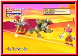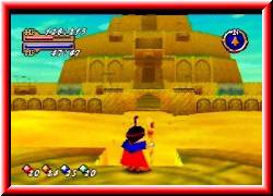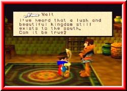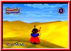 | Aber mehr als 20 HP zieht mir das nicht ab. Nach ein paar Sanddünen sehe ich in der Ferne zwischen zwei großen Bergen eine Lücke die in die freie Fläche führt. Also drauf zu. Doch Halt. Links neben dem Eingang steht ein kleines Haus das wie eine Festung im Mittelalter aussieht. Und tatsächlich. Drinnen steht ein Soldat der höchst motivierende Infos parat hat. Denn irgendwo in der großen Wüste befindet sich ein geheimes Königreich. Zumindest erzählt man sich das. Noch niemand hat es aber je gefunden. Bevor ich wieder losgehe finde ich in einem hinteren Raum wieder eine Kiste mit einem Item. Voller Erwartung geht's los. Endlich stehe ich am Eingang der Wüste. Überall Sand und kleine Sandberge. Das Wort Orientierung bekommt hier eine ganz neue Bedeutung. Denn Bezugspunkte findet man hier logischerweise keine. | ![]() |