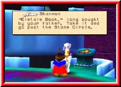 | Doch diesmal sollte meine Frage nicht lange unbeantwortet bleiben. Durch ein Treppenhaus und dunkle aber kurze Gänge gelange ich in's freie auf eine Plattform die von dunkler Nachtatmosphäre umgeben ist. Was die Sache wieder so unheimlich macht ist diesmal völlig fehlende Musik. Totenstille!! Verfehlt seine Wirkung nicht. Hier auf der Plattform treffe ich Shannon. Diese klärt mich ein wenig auf. Mammon ist das Oberhaupt des Bösen und die Wurzel allen übels auf Cetland. Die 4 Diebe, die die Steine in ihren Händen hielten waren Mammons Gehilfen. Durch die Verteilung der Steine war die Macht des Eletale's Book gebrochen und er konnte Angst und Schrecken in Cetland verbreiten. Plötzlich übergibt mir Shannon das Eletale's Book, da ich alle 4 Steine besitze und so die Mächte der Natur wieder zusammenführen kann. | ![]() |