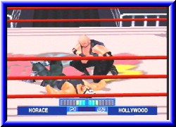 | Vor dem Auswählen des Wrestlers werdet ihr nach dem Schwierigkeitsgrad gefragt. Nicht ganz ohne Grund, den je nach Schwierigkeitsgrad werden versteckte Kämpfer freigespielt. Denn wenn ihr anschließend durch die Listen scrollt werdet ihr viele Fragezeichen sehen. Der nächste Bildschirm zeigt den momentanen Titelinhaber und die Herrausfordererliste. Als Frischling seid ihr natürlich nicht gesetzt. Man muß ja seinen Ruf erst einmal erarbeiten. Also schickt die Konkurrenten auf die Matte und den Titelverteidiger gleich hinterher. Gut ist, das man nach jedem Fight speichern kann. Auf sagenhaften 2 Pages. Der Einmarsch der Gladiatoren erfolgt mit original Musik und Gesten der Wrestler und einer angedeuteten Pyroshow. Untermalt wird das ganze von einem stimmgewaltigem Kommentator und Hallensprecher. Schon bei der Vorstellung der Kämpfer kann man hören, wem das Publikum mehr zugeneigt ist. Doch dann geht es auch schon los. Wer sich noch nicht ganz so mit der Tastenbelegung und der Movelist klar ist, kann im Pausenmenu unter Controller Layout nachsehen. Dort sind alle Situationen und welche Taste welchen Move erzeugt erläutert. Leider muß ich sagen, sehr undetailiert. B=Grapple Move, A=Grapple Move u.s.w. Das haben wir auch schon mal besser gesehen. Dafür sehen wir eine glasklare Grafik mit einer dynamischen Kamerafahrt und gut zu unterscheidende Moves. Für alle die sich mit den Moves nicht so auskennen, sagt der Kommentator fast jeden an. Insgesamt macht der Schreihals am Mikro eine verdammt gute Figur. Von einem überraschten "What is this???" bis zum vielsagenden "Oh-Oh!!!". Unten im Bild sehen wir das Sympathiemeter. Je besser ihr in den Augen der Fans kämpft um so mehr wird es für euch ausschlagen. Ist es rot und blinkt, dann kann man einen Finishermove landen. Das wird auch angezeigt mit "Finish Him". Außerhalb des Ringes liegen diverse Stühle umher, die man auch gut für seine Zwecke gebrauchen kann. :-) Sollte man keinen Bock mehr auf den Ring haben und mal was anderes sehen wollen, bei Mayhem kein Problem. Geht einfach aus dem Ring Richtung Ausgang und seht zu, das euer Gegner nachkommt. Dann wird es interessant. Ihr landet in einer von 13 verschiedenen Backstages . Das kann ein Korridor sein, oder ein Parkplatz oder das Badezimmer. Dort kann man natürlich auch das Match beenden. So klettert ihr die Herausfordererleiter immer höher und irgendwann seid ihr fällig für den Titelkampf. |