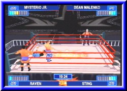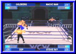 | Gleich zu Beginn des neuen Jahres, schlägt EA im wahrsten Sinne des Wortes zu. Mit WCW Mayhem. Ein weiteres Wrestlinggame am N64 Horizont. Auch Mayhem muß sich an seinen "älteren" Vorgängern messen lassen. Insgesamt 50 Wrestler der WCW stehen oder taumeln bei Mayhem im Ring. Wobei die WCW eigentlich nur als Dachverband agiert. Viele Wrestler sind ja in eigenen kleinen Grüppchen und Vereinen untergebracht. Ich denke da an Gruppen wie NWO Black and White, NWO Wolfpac oder die reine WCW. Aus jeder Riege sind die besten am Start. Typen wie Sting (der rote natürlich), Kevin Nash, Stevie Ray oder auch DDP. Noch bevor ihr Zugriff auf das Mainmenu habt, checkt das Modul erst einmal eure MemCard, ob schon ein Savegame verewigt wurde. Wenn nicht, werden spärliche 22 Pages für die Options verwendet. Danach kann man das Mainmenu nutzen. Ob nun zu einem Quickmatch, wo man schon einmal in die Materie hineinriechen kann, oder man startet gleich voll durch und stürzt sich in ein Main Event. Dort steht gleich die Creme de la Creme an Events zur Verfügung. Zum Bsp. ein Handicap-,Triangle-, Tag Team Match oder gar die Battle Royal. Bei Quest for the Best steigt das Gerangel um die Gürtel, die von ihren Besitzern zu holen sind. Man beginnt um den Kampf um den TV Title, gefolgt vom U.S. Heavyweight und dem WCW Championchip. |