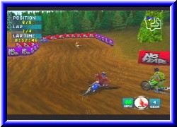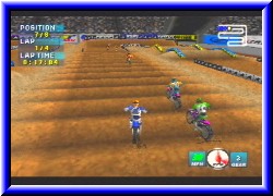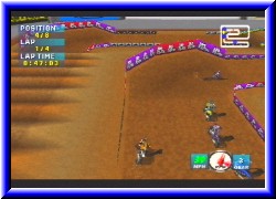 Dabei muß man auf nichts verzichten. Weder der Speed noch die grafischen Details wurden heruntergefahren. Einzig die Fahrer sind etwas kleiner, was durch die Bildschirmaufteilung bedingt ist. Hier kann man mit einem Freund und z.b. 20 Runden pro Rennen sehr lang seinen Spaß haben. Gegenüber EA's Supercross kann man hier auch zu dritt und zu viert an den Start gehen. Auch hier kann man nun alle Meisterschaften fahren. Leider aber jetzt ohne Gegner, sondern nur zwischen den menschlichen Spielern. Aber gerade zu viert auch ein langanhaltener Spaß. Cool ist es bei 3 Fahrern. Im jetzt freien Bildausschnitt für den vierten Fahrer fährt immer einer Live Kamera mit und zeigt das Geschehen aus der Vogelperspektive. Mal was anderes und kommt sehr gut rüber. Auch hier ändert sich am Speed und an der Grafik kaum etwas. Einzig die Framerate auf manchen Outdoor Strecken geht ab und zu in die Knie. Highlight für die Multiplayer Modis wie auch im 1P Modus ist die Möglichkeit die eigens erstellten Fahrer und Strecken zu einer Meisterschaft zu bilden. Der enthaltene Streckeneditor bietet die Möglichkeit Strecken zu erstellen, die den enthaltenen in nichts nachstehen. Man hat alle möglichen Streckenteile zur Verfügung und kann auch von der Größe her die Indoor Strecken ausladend gestalten. Bindet man die Strecken in einer Meisterschaft ein wird das Stadion und die Zuschauerränge drum herum gebaut, so das kein Unterschied zu den enthaltenen besteht. So kann im 1P Modus gegen die Computerfahrer auch auf diesen Strecken eine komplette Meisterschaft fahren. Leider kann man nur Indoor Strecken basteln, was aber trotzdem mehr als ausreicht. Jede Strecke kann man auf der Memory Card abspeichern und so eine ganze Sammlung anlegen. Dadurch ist auch auf lange Sicht viel Abwechslung beim Streckendesign geboten. Die letzte Möglichkeit im Spiel ist der Time Trial.